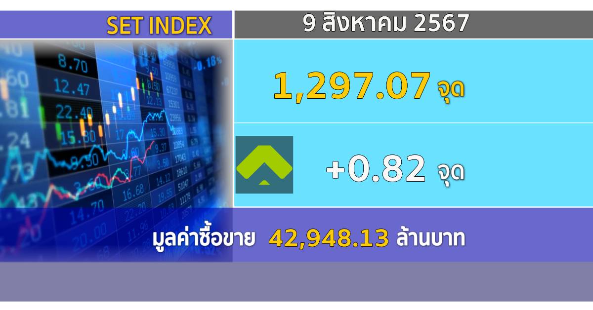 9 ส.ค. – SET ปิดวันนี้ 1,297.07 จุด เพิ่มขึ้น 0.82 จุด (+0.06%) มูลค่าซื้อขาย 42,948.13 ล้านบาท