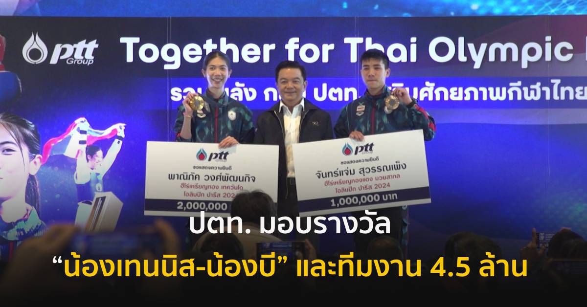 ปตท.สำนักงานใหญ่ 15 ส.ค. – ปตท. มอบเงินรางวัลให้กับ “น้องเทนนิส” พาณิภัค วงศ์พัฒนกิจ และ “น้องบี” จันทร์แจ่ม สุวรรณเพ็ง สองฮีโร่โอลิมปิกเกมส์ รวมถึงสมาคม และทีมงาน รวม 4.5 ล้านบาท