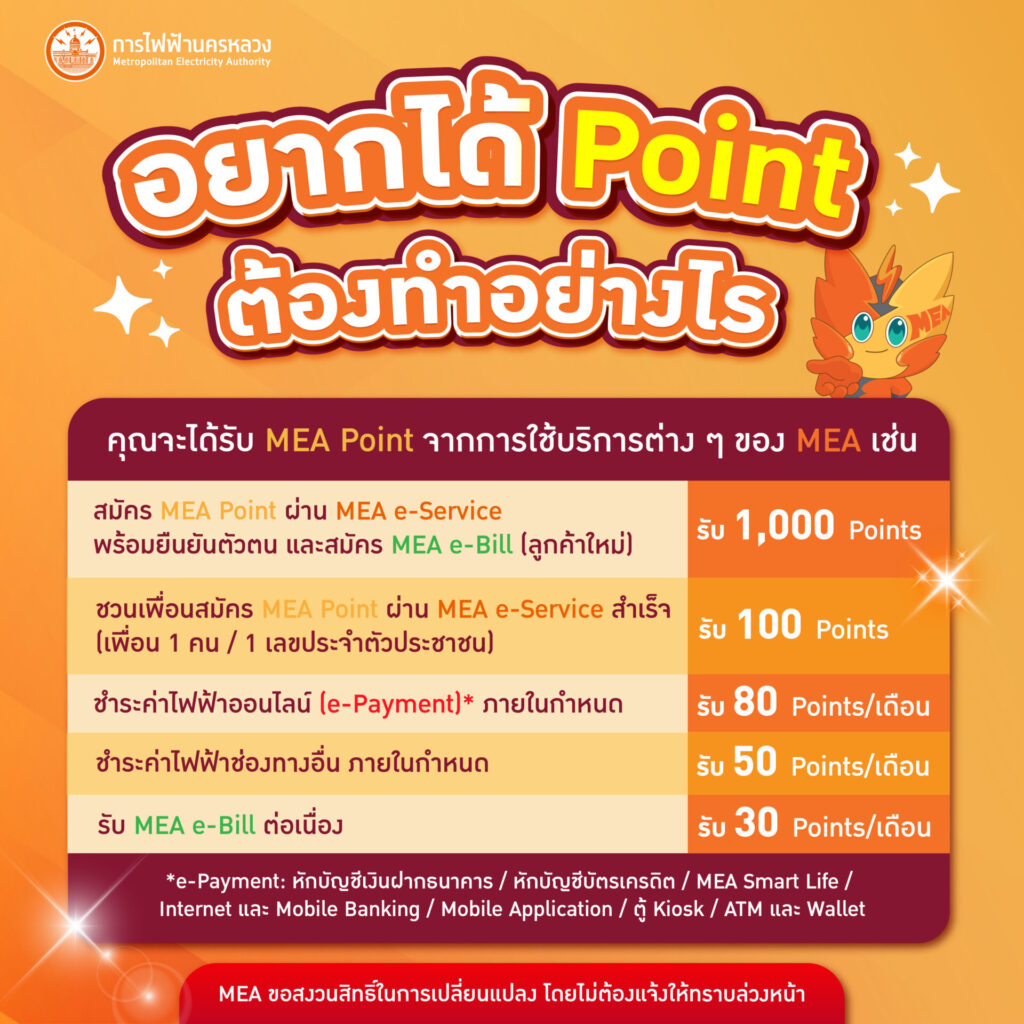 - สมัคร MEA Point ผ่าน MEA e-Service พร้อมยืนยันตัวตน และสมัคร MEA e-Bill รับ 1,000 Points