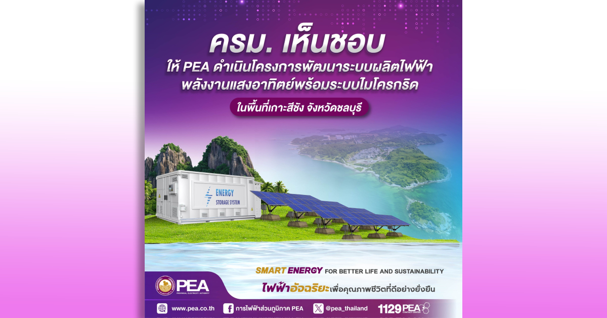 ตามที่คณะรัฐมนตรีเห็นชอบเมื่อวันที่ 1 ก.ค.2568 มีมติเห็นชอบให้ การไฟฟ้าส่วนภูมิภาค (PEA) ดำเนินโครงการพัฒนาระบบผลิตไฟฟ้าพลังงานแสงอาทิตย์พร้อมระบบไมโครกริด ในพื้นที่เกาะสีชัง จังหวัดชลบุรี วงเงินลงทุนรวม 255 ล้านบาท