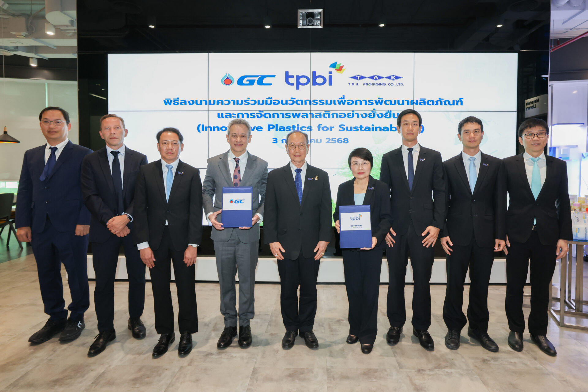 บริษัท พีทีที โกลบอล เคมิคอล จำกัด (มหาชน) หรือ GC ผู้นำในธุรกิจพลาสติกและเคมีภัณฑ์ระดับสากล เพื่อสร้างสรรค์คุณภาพชีวิต และ บริษัท ทีพีบีไอ จำกัด (มหาชน) หรือ TPBI Group ผู้นำด้านการผลิตและส่งออกบรรจุภัณฑ์แบบครบวงจรของไทย ที่ได้รับการยอมรับจากลูกค้าชั้นนำทั่วโลก ร่วมลงนามในบันทึกข้อตกลงความร่วมมือด้านนวัตกรรมเพื่อการพัฒนาผลิตภัณฑ์และการจัดการพลาสติกอย่างยั่งยืน ภายใต้แนวคิด “Innovative Plastics for Sustainability” ณ Customer Solutions Center (CSC) ศูนย์เอนเนอร์ยี่คอมเพล็กซ์ อาคารเอ ชั้น 1