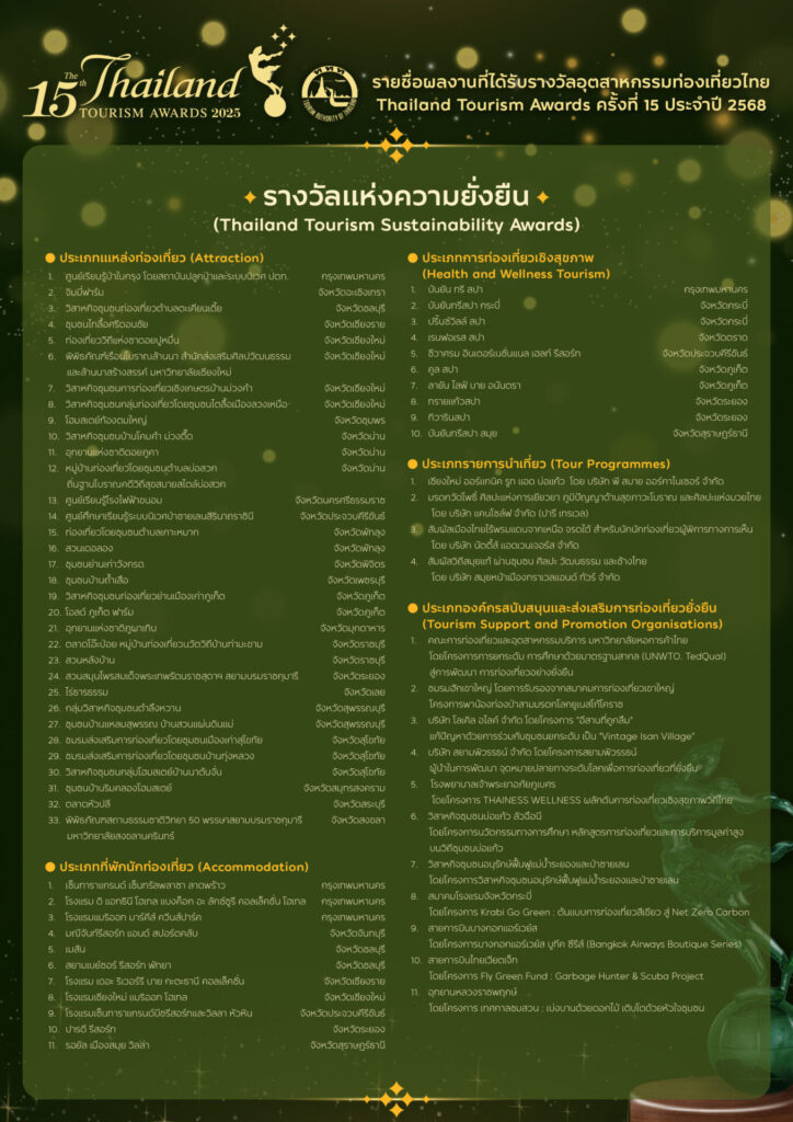 5 ก.ย. – ททท. ประกาศผลรางวัลอุตสาหกรรมท่องเที่ยวไทย Thailand Tourism Awards ครั้งที่ 15 ประจำปี 2568 เชิดชูผู้ประกอบการคุณภาพ รวม 151 รางวัล