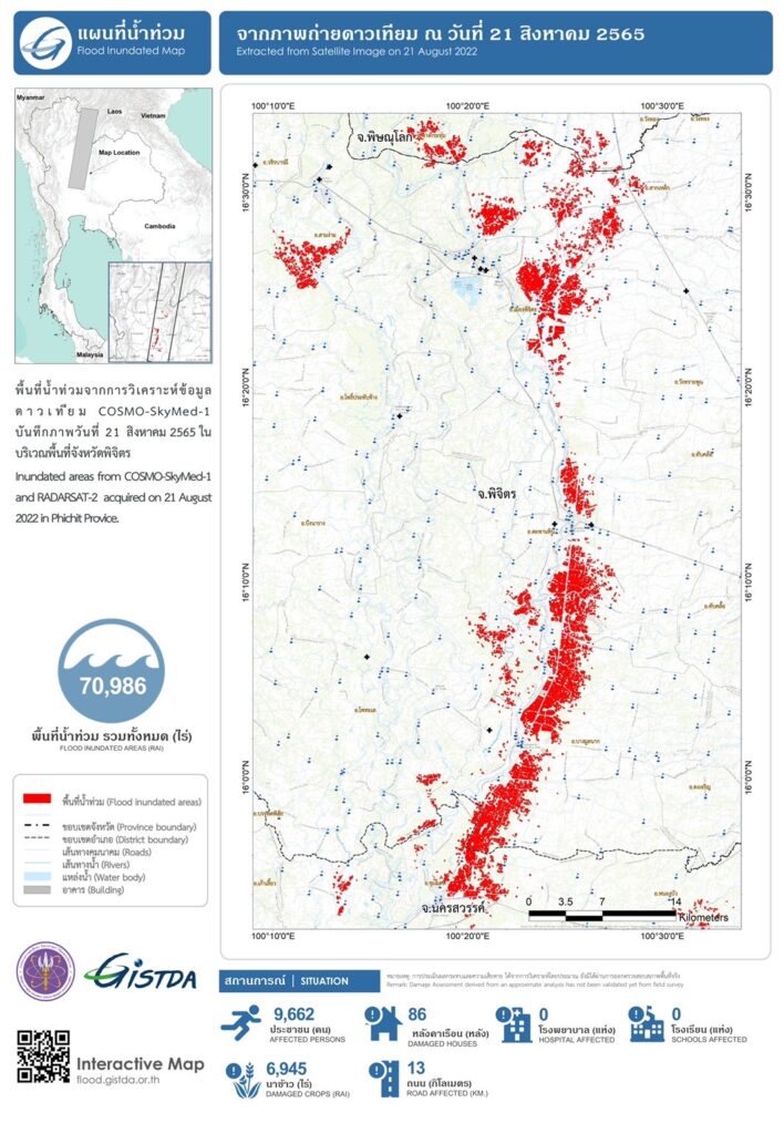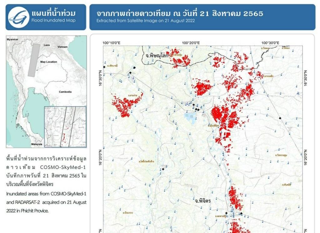 สำนักงานพัฒนาเทคโนโลยีอวกาศและภูมิสารสนเทศ (GISTDA) ใช้ดาวเทียม COSMO-SkyMed-1 (คอสโม สกายเมด 1) ของวันอาทิตย์ที่ 21 สิงหาคม 2565 พบพื้นที่น้ำท่วมขังในบางส่วนของจังหวัด #พิจิตร 70,986 ไร่ ซึ่งส่วนใหญ่เป็นพื้นที่เกษตรกรรมในพื้นที่ลุ่มต่ำ และริมสองฝั่งแม่น้ำสายหลักสายรองของพื้นที่โดยรอบ ซึ่งรวมถึงชุมชนที่อยู่อาศัย และเส้นทางคมนาคมบางส่วน ในขณะที่พื้นที่ปลูกข้าวได้รับผลกระทบแล้วรวมเกือบ 7 พันไร่