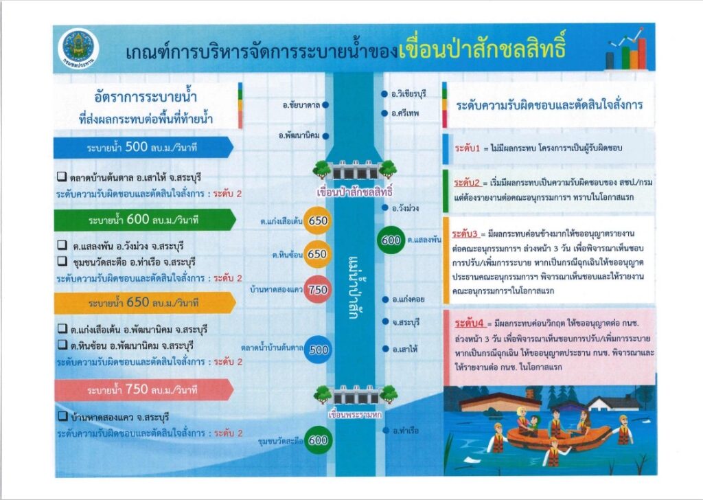 การปรับเพิ่มการระบายน้ำจากเขื่อนป่าสักชลสิทธิ์จะปรับแบบเป็นขั้นบันได ตั้งแต่วันที่ 27 สิงหาคม 2565 เป็นต้นไป จากอัตรา 34.56 ล้านลูกบาศก์เมตร/วัน เป็น 43.20 ล้านลูกบาศก์เมตร/วัน หรือจาก 400 ลูกบาศก์เมตร/วินาที เป็นประมาณ 500 ลูกบาศก์เมตร/วินาที เมื่อน้ำจำนวนนี้ไหลลงไปรวมกับปริมาณน้ำจากคลองชัยนาท-ป่าสักแล้ว จะควบคุมปริมาณน้ำไหลผ่านเขื่อนพระรามหก ในอัตราไม่เกิน 600 ลูกบาศก์เมตร/วินาที