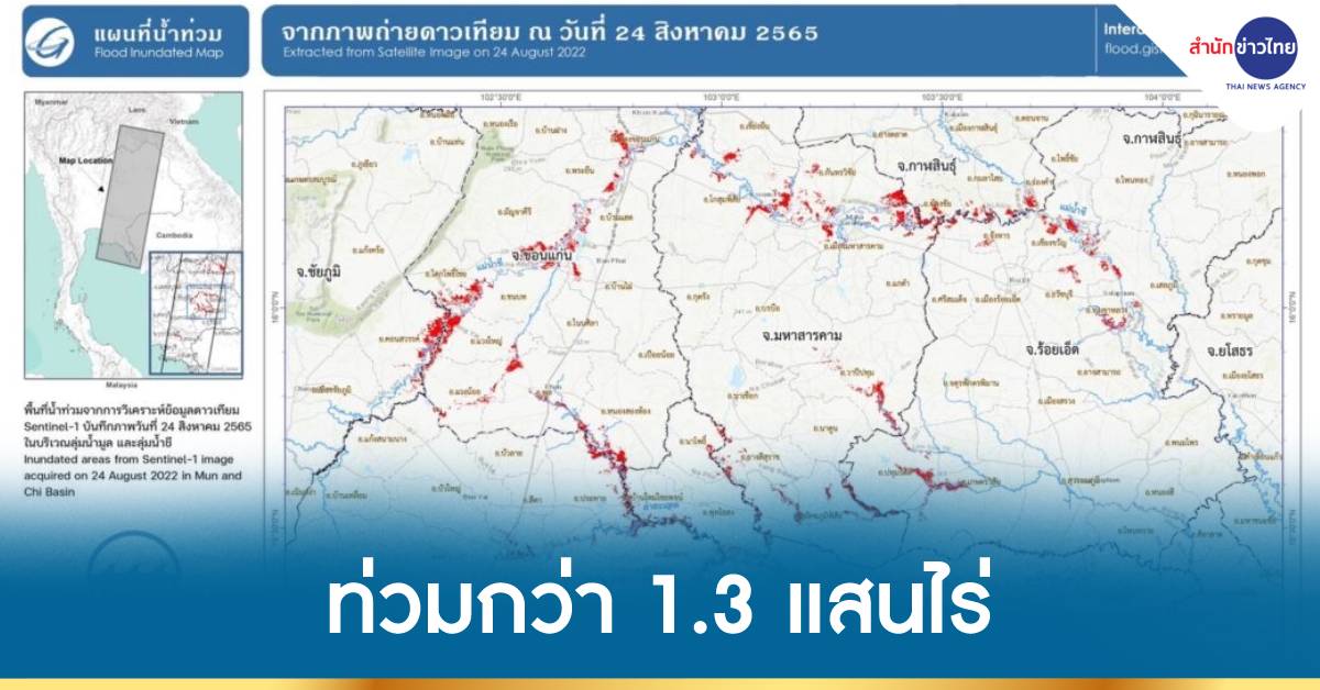 กรุงเทพฯ 25 ส.ค.- GISTDA เผยข้อมูลจากดาวเทียมชี้ ลุ่มน้ำชีและมูล มีพื้นที่น้ำท่วมขังกว่า 1.3 แสนไร่ โดยกระทบพื้นที่เกษตรแล้วกว่า 70,000 ไร่