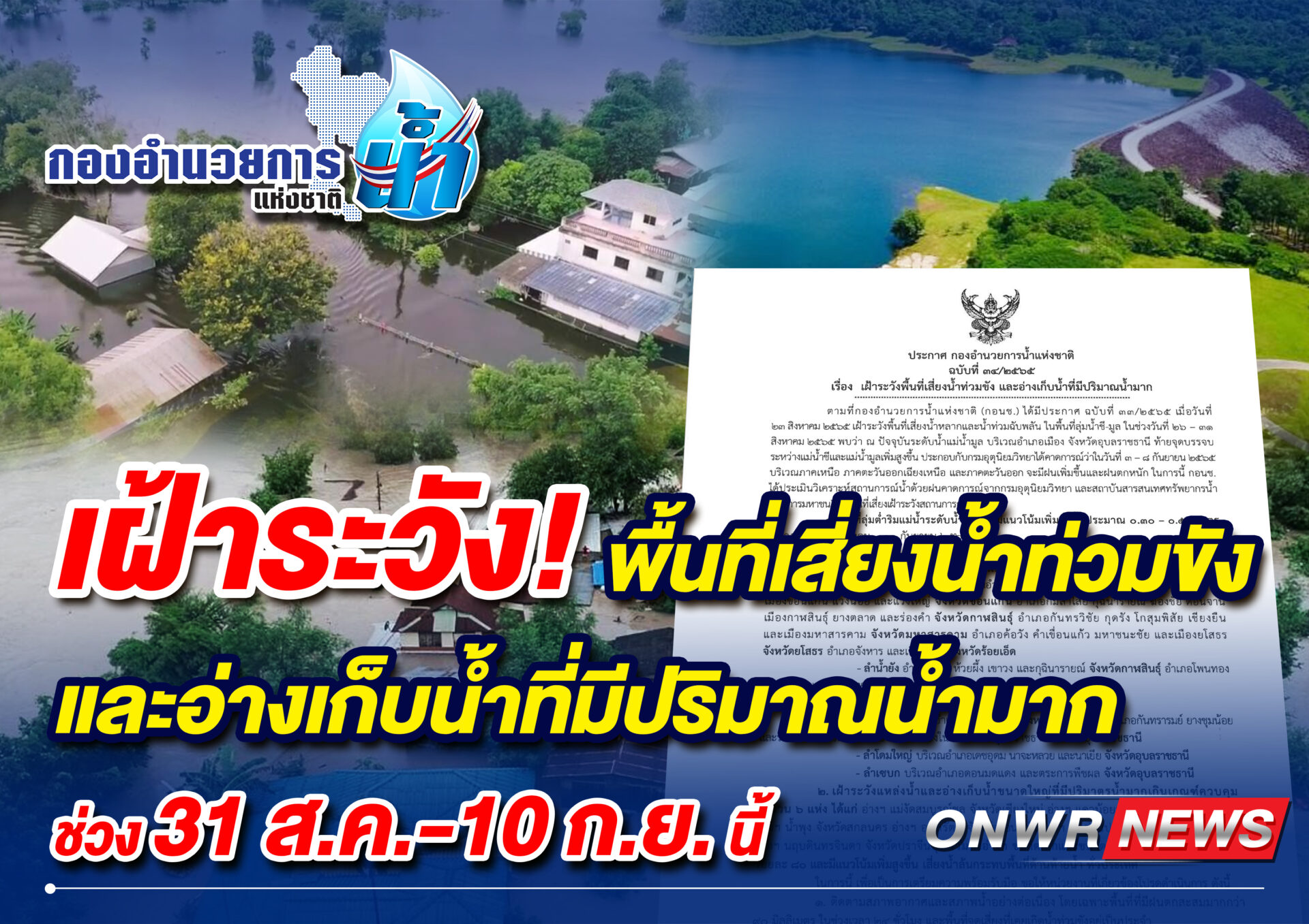 กรุงเทพฯ 30 ส.ค. – กองอำนวยการน้ำแห่งชาติออกประกาศเรื่อง เฝ้าระวังพื้นที่เสี่ยงน้ำท่วมขังในลุ่มน้ำชีและมูล รวมถึงเตือนเฝ้าระวังอ่างเก็บน้ำที่มีปริมาณน้ำมากเกินเกณฑ์ควบคุม 6 แห่งเนื่องจากจะมีจากฝนตกเพิ่มขึ้นระหว่างวันที่ 3-8 ก.ย. นี้
