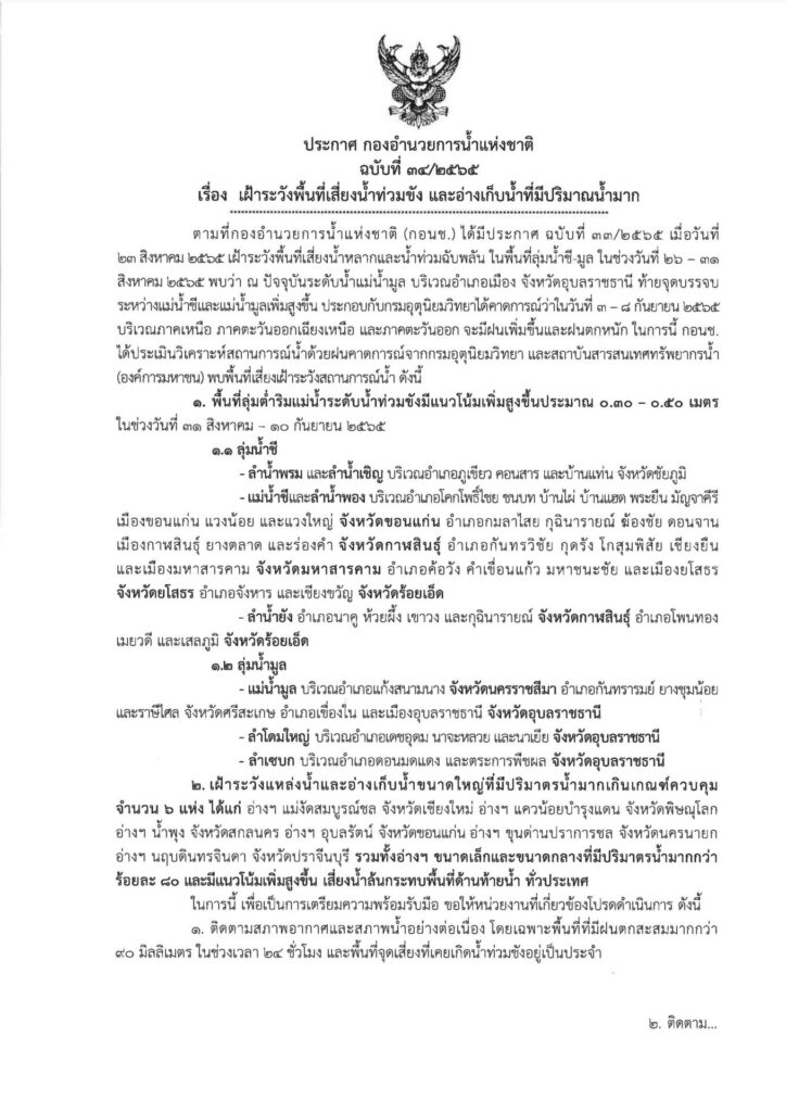 นายชยันต์ เมืองสง รองเลขาธิการสำนักงานทรัพยากรน้ำแห่งชาติ (สทนช.) กล่าวว่า กองอำนวยการน้ำแห่งชาติ (กอนช.) ติดตามสถานการณ์น้ำพบว่า ปัจจุบันระดับน้ำแม่น้ำมูล บริเวณอำเภอเมือง จังหวัดอุบลราชธานี ท้ายจุดบรรจบระหว่างแม่น้ำชีและแม่น้ำมูลเพิ่มสูงขึ้น ประกอบกับกรมอุตุนิยมวิทยาได้คาดการณ์ว่า ในวันที่ 3 – 8 กันยายน 2565 บริเวณภาคเหนือ ภาคตะวันออกเฉียงเหนือ และภาคตะวันออก จะมีฝนเพิ่มขึ้นและฝนตกหนัก ในการนี้ กอนช. ได้ประเมินวิเคราะห์สถานการณ์น้ำด้วยฝนคาดการณ์จากกรมอุตุนิยมวิทยา และสถาบันสารสนเทศทรัพยากรน้ำ (องค์การมหาชน) พบพื้นที่เสี่ยงเฝ้าระวังสถานการณ์น้ำ ดังนี้