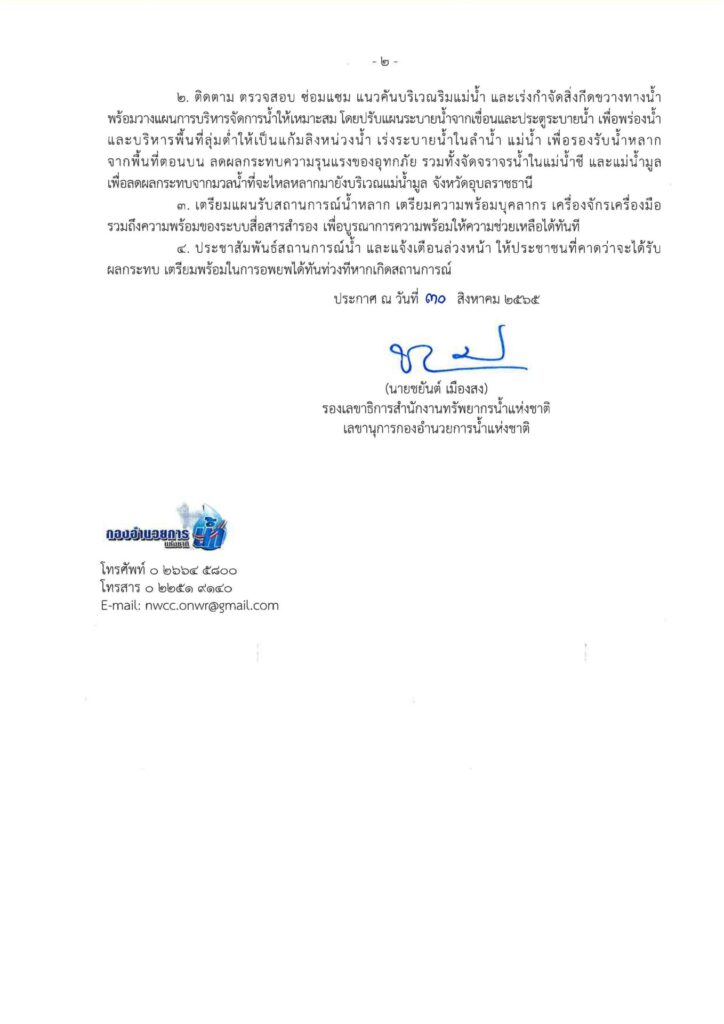 2. ติดตาม ตรวจสอบ ซ่อมแซม แนวคันบริเวณริมแม่น้ำ และเร่งกำจัดสิ่งกีดขวางทางน้ำ พร้อมวางแผนการบริหารจัดการน้ำให้เหมาะสม โดยปรับแผนระบายน้ำจากเขื่อนและประตูระบายน้ำ เพื่อพร่องน้ำและบริหารพื้นที่ลุ่มต่ำให้เป็นแก้มลิงหน่วงน้ำ เร่งระบายน้ำในลำน้ำ แม่น้ำ เพื่อรองรับน้ำหลากจากพื้นที่ตอนบน ลดผลกระทบความรุนแรงของอุทกภัย รวมทั้งจัดจราจรน้ำในแม่น้ำชี และแม่น้ำมูล เพื่อลดผลกระทบจากมวลน้ำที่จะไหลหลากมายังบริเวณแม่น้ำมูล จังหวัดอุบลราชธานี