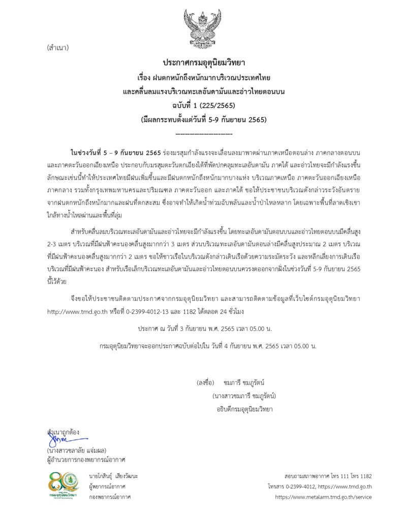 สำหรับคลื่นลมบริเวณทะเลอันดามันและอ่าวไทยจะมีกำลังแรงขึ้น โดยทะเลอันดามันตอนบนและอ่าวไทยตอนบนมีคลื่นสูง 2-3 เมตร บริเวณที่มีฝนฟ้าคะนองคลื่นสูงมากกว่า 3 เมตร ส่วนบริเวณทะเลอันดามันตอนล่างมีคลื่นสูงประมาณ 2 เมตร บริเวณที่มีฝนฟ้าคะนองคลื่นสูงมากกว่า 2 เมตร ขอให้ชาวเรือในบริเวณดังกล่าวเดินเรือด้วยความระมัดระวัง และหลีกเลี่ยงการเดินเรือบริเวณที่มีฝนฟ้าคะนอง ส่วนเรือเล็กบริเวณทะเลอันดามันและอ่าวไทยตอนบนควรงดออกจากฝั่งในช่วงวันที่ 5-9 กันยายน 2565 นี้ไว้ด้วย