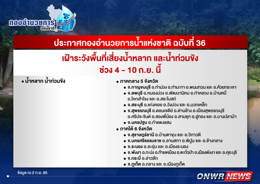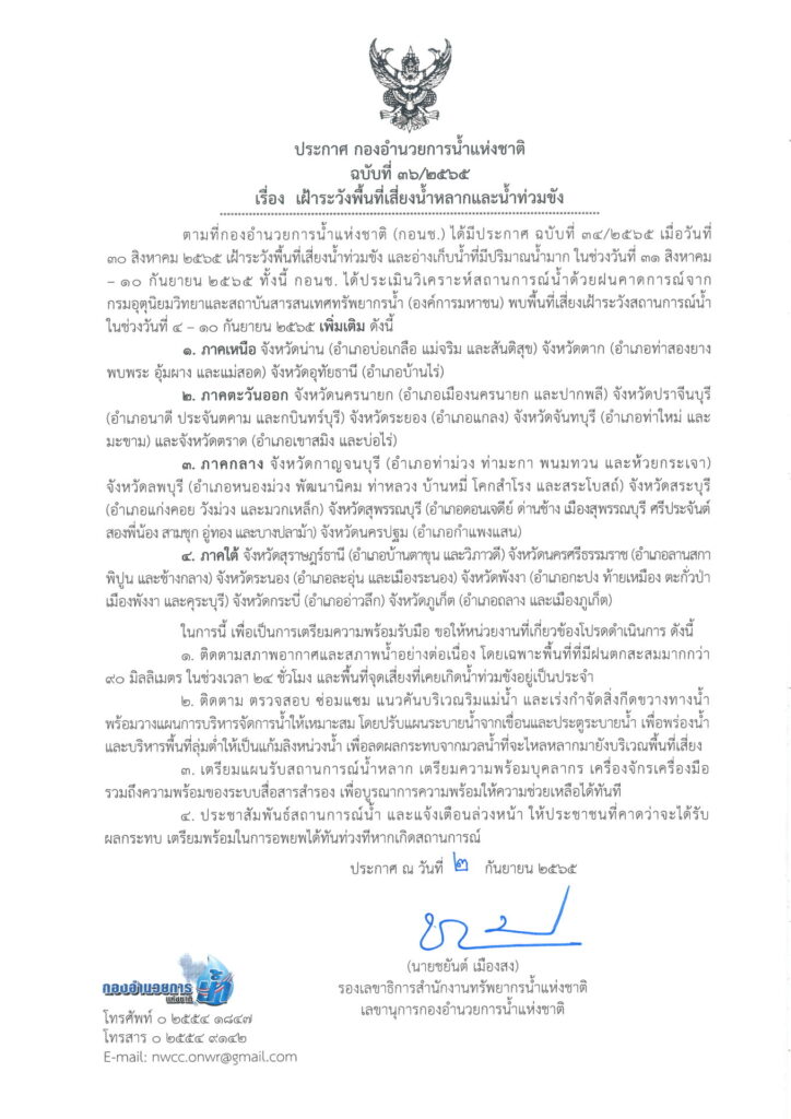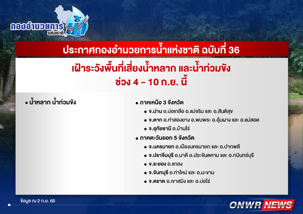 นายชยันต์ เมืองสง รองเลขาธิการสำนักงานทรัพยากรน้ำแห่งชาติ (สทนช.) ในฐานะเลขานุการองอำนวยการน้ำแห่งชาติ (กอนช.) กล่าวว่า กอนช. ออกประกาศเรื่องเฝ้าระวังพื้นที่เสี่ยงน้ำหลากและน้ำท่วมขังจากการประเมินวิเคราะห์สถานการณ์น้ำด้วยฝนคาดการณ์จากกรมอุตุนิยมวิทยาและสถาบันสารสนเทศทรัพยากรน้ำ (องค์การมหาชน) พบพื้นที่เสี่ยงเฝ้าระวังสถานการณ์น้ำ ในช่วงวันที่ 4 – 10 กันยายน 2565 ดังนี้