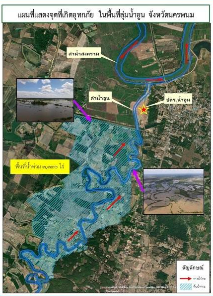 จากอิทธิพลของระดับน้ำแม่น้ำโขงที่สูงขึ้นหนุนให้ระดับน้ำลำน้ำสงครามยกตัวสูงขึ้นตามและระบายน้ำออกลำบาก จากนั้นส่งผลให้ระดับน้ำในลำน้ำอูนบริเวณเหนือประตูระบายน้ำน้ำอูนยกตัวสูงขึ้นด้วย ก่อนหน้านี้โครงการชลประทานนครพนมได้เตรียมพร้อมโดยแขวนบานระบายทั้งหมดเพื่อเร่งระบายน้ำแล้วตั้งแต่วันที่ 12 ก.ค. แต่ฝนตกโดยตลอด อีกทั้งระดับน้ำแม่น้ำโขงยังสูงอยู่จึงทำให้น้ำไหลล้นตลิ่งเข้าท่วมพื้นที่ลุ่มต่ำทั้ง 2 ฝั่งลำน้ำอูนในต. บ้านเอื้องและท่าบ่อสงคราม อ. ศรีสงคราม 3,310 ไร่