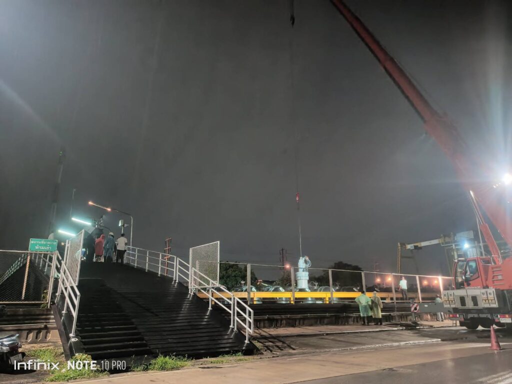 ปทุมธานี 8 ก.ย.- กรมชลประทานเร่งติดตั้งเครื่องสูบน้ำเสริมที่สถานีสูบน้ำกึ่งถาวรปากคลองรังสิตประยูรศักดิ์ จังหวัดปทุมธานี เสริมประสิทธิภาพการระบายน้ำออกสู่แม่น้ำเจ้าพระยา โดยดำเนินการตลอดคืน เช้านี้ติดตั้งแล้ว 6 เครื่อง จะดำเนินการให้ครบ 9 เครื่อง และจะเดินเครื่องรวม 20 เครื่อง ในวันนี้ เพื่อลดระดับน้ำในคลองรังสิตประยูรศักดิ์ให้สามารถรองรับน้ำที่ระบายจากพื้นที่ รวมทั้งรับน้ำจากฝนที่ตกลงมาเพิ่ม