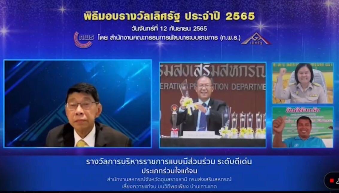สำนักงานคณะกรรมการพัฒนาระบบราชการ (สำนักงาน ก.พ.ร.) จัดพิธีมอบรางวัลเลิศรัฐประจำปี พ.ศ. 2565 ผ่านระบบอิเล็กทรอนิกส์ (Zoom Meeting) โดยมีนายวิษณุ เครืองาม รองนายกรัฐมนตรีเป็นประธานในพิธีมอบรางวัลโดยกรมส่งเสริมสหกรณ์ซึ่งได้รับรางวัลใน 2 สาขา 11 รางวัลจัดสถานที่รับมอบรางวัลที่กรมส่งเสริมสหกรณ์ เทเวศร์กรุงเทพฯ มีคณะผู้บริหาร ข้าราชการ และเจ้าหน้าที่เข้าร่วมรับชมงานและส่งแรงใจเชียร์ พร้อมการถ่ายทอดสดออนไลน์การจัดพิธีมอบรางวัลไปยังหน่วยงานส่วนภูมิภาคและสหกรณ์ภาคีเครือข่าย