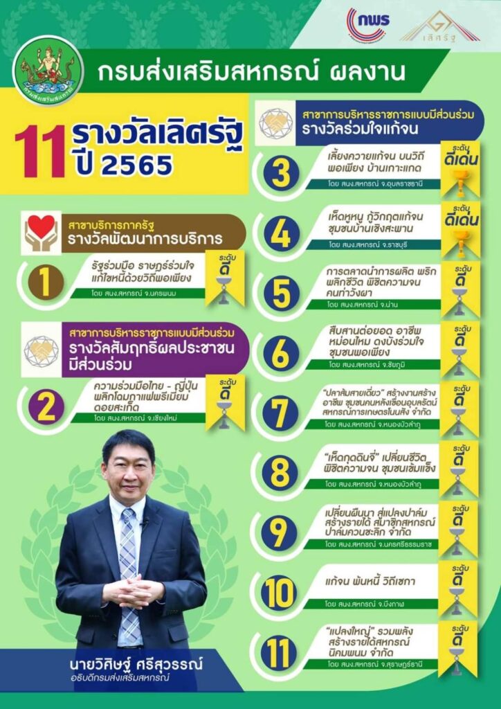 สำหรับรางวัลของกรมส่งเสริมสหกรณ์ที่ได้รับในปี 2565 ที่ได้รับรวม 11 รางวัล ประกอบด้วย