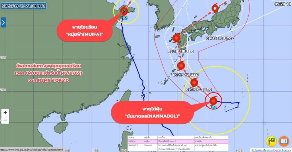 นางสาวชมภารี ชมภูรัตน์ อธิบดีกรมอุตุนิยมวิทยากล่าวว่า กรมอุตุนิยมวิทยาติดตามเส้นทางการเคลื่อนตัวของพายุหมุนเขตร้อน ล่าสุดวันนี้ (16 ก.ย.) พายุไต้ฝุ่น “นันมาดอล (NANMADOL)” บริเวณมหาสมุทรแปซิฟิกตะวันตก กำลังเคลื่อนตัวทางตะวันตกเฉียงเหนือ มีแนวโน้มเคลื่อนตัวสู่ประเทศญี่ปุ่นช่วงวันที่ 17- 18 ก.ย. พายุลูกนี้ไม่มีอิทธิพลต่อประเทศไทย