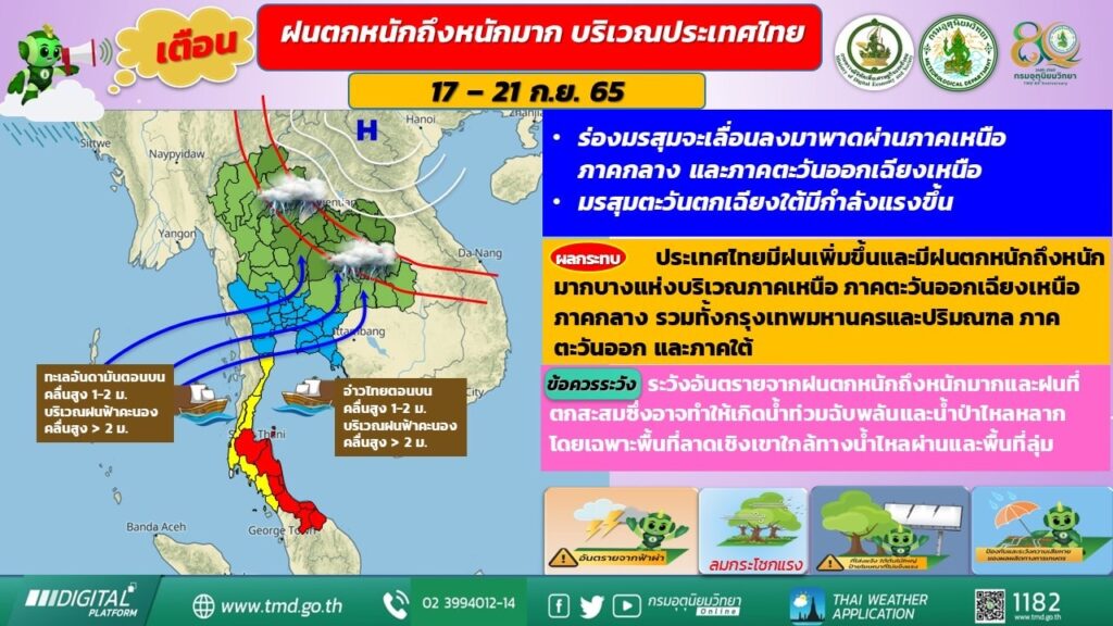 จากการติดตามสภาพอากาศพบว่า ช่วงวันที่ 17 – 21 ก.ย. บริเวณความกดอากาศสูงหรือมวลอากาศเย็นจากประเทศจีนจะแผ่ลงมาปกคลุมประเทศลาวและเวียดนามตอนบน ส่งผลทำให้ร่องมรสุมเลื่อนลงมาพาดผ่านภาคเหนือ ภาคกลาง และภาคตะวันออกเฉียงเหนือ ประกอบกับมรสุมตะวันตกเฉียงใต้ที่พัดปกคลุมทะเลอันดามัน ประเทศไทย และอ่าวไทยจะมีกำลังแรงขึ้น ทำให้ประเทศไทยมีฝนเพิ่มขึ้นกับมีฝนตกหนักถึงหนักมาก และมีลมกระโชกแรงบางแห่งบริเวณภาคเหนือ ภาคตะวันออกเฉียงเหนือ ภาคกลาง รวมทั้งกรุงเทพมหานครและปริมณฑล ภาคตะวันออก และภาคใต้ จึงออกประกาศแจ้งเตือนให้ประชาชนระวังอันตรายจากฝนตกหนักถึงหนักมากและฝนที่ตกสะสมซึ่งอาจทำให้เกิดน้ำท่วมฉับพลันและน้ำป่าไหลหลาก โดยเฉพาะพื้นที่ลาดเชิงเขาใกล้ทางน้ำไหลผ่านและพื้นที่ลุ่มในระยะนี้