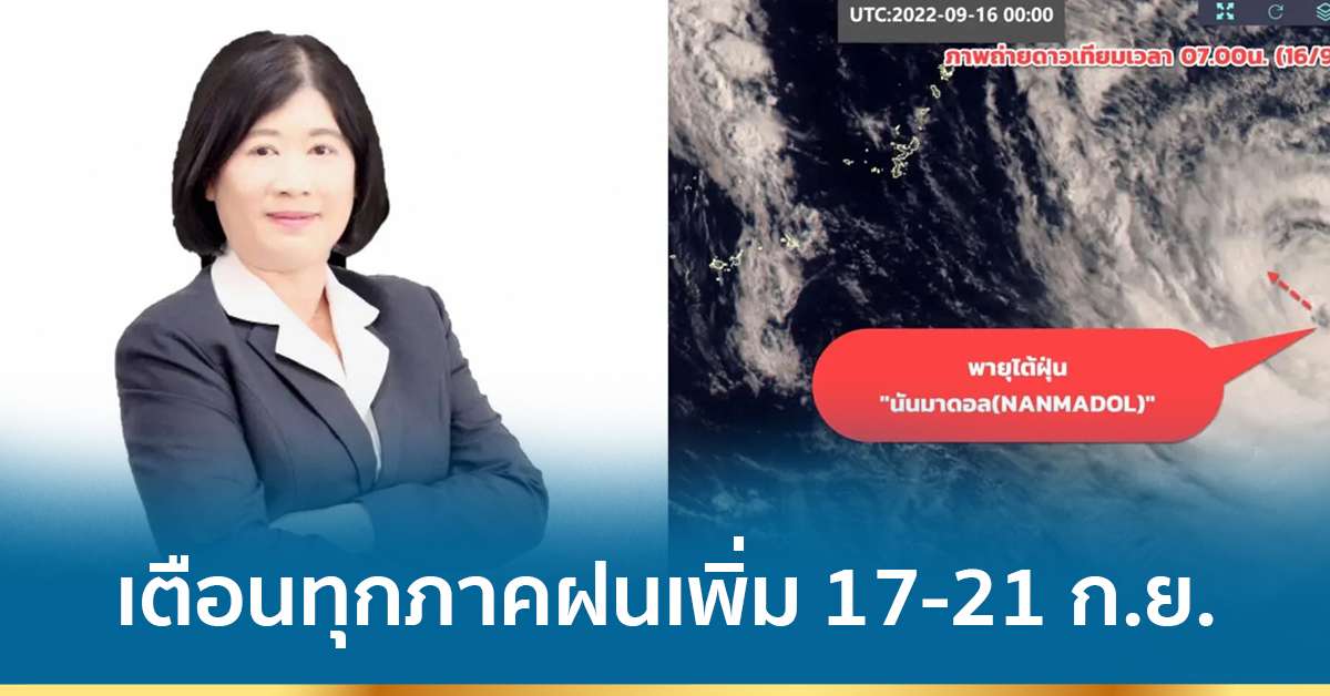 กรุงเทพฯ 16 ก.ย.- อธิบดีกรมอุตุนิยมวิทยาระบุ พายุไต้ฝุ่น “นันมาดอล” บริเวณมหาสมุทรแปซิฟิกตะวันตก มีแนวโน้มเคลื่อนตัวสู่ประเทศญี่ปุ่น ช่วงวันที่ 17- 18 ก.ย. โดยไม่มีผลต่อประเทศไทย แต่แจ้งเตือนร่องมรสุมพาดผ่านภาคเหนือ ภาคกลาง และภาคตะวันออกเฉียงเหนือ ประกอบกับมรสุมตะวันตกเฉียงใต้กำลังแรงจะทำให้มีฝนตกหนักถึงหนักมากบางแห่งในทุกภาค รวมถึงกทม. และปริมณฑลระหว่าง 17-21 ก.ย. นี้ อาจทำให้เกิดน้ำท่วมฉับพลันและน้ำป่าไหลหลาก