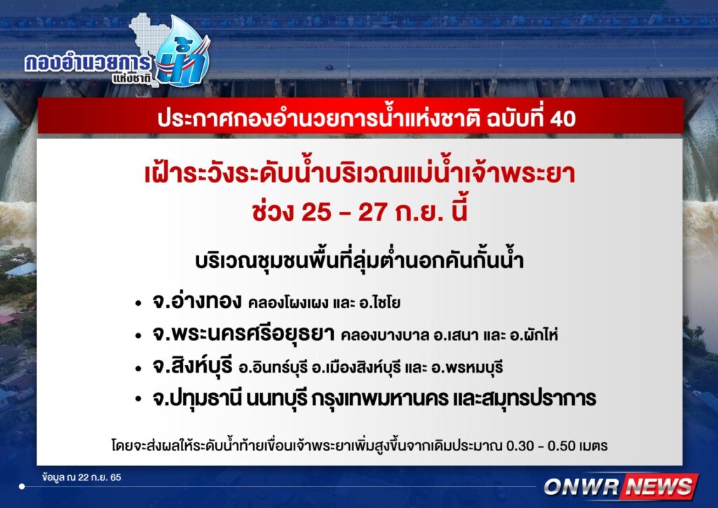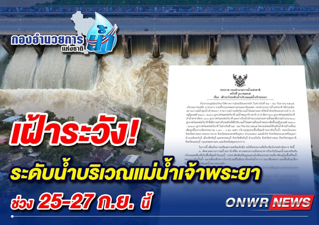 กรุงเทพฯ 23 ก.ย. – กอนช. ประกาศเตือน 7 จังหวัดท้ายเขื่อนเจ้าพระยา เฝ้าระวังระดับน้ำที่จะสูงขึ้น 30-50 ซม. เนื่องจากจำเป็นต้องระบายน้ำผ่านเขื่อนเจ้าพระยาเพิ่มขึ้น กำชับหน่วยงานที่เกี่ยวข้องเฝ้าระวัง โดยให้กรมชลประทาน แบ่งระบายน้ำตั้งแต่เหนือเขื่อนเข้าระบบชลประทาน 2 ฝั่งแม่น้ำ ลดปริมาณน้ำไหลผ่านเขื่อนสู่ตอนล่าง