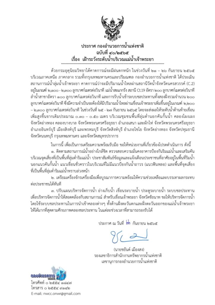 นายชยันต์ เมืองสง รองเลขาธิการสำนักงานทรัพยากรน้ำแห่งชาติ (สทนช.) ในฐานะเลขานุการกองอำนวยการน้ำแห่งชาติ (กอนช.) กล่าวว่า ได้ออกประกาศแจ้งเตือน 7 จังหวัดเฝ้าระวังระดับน้ำบริเวณแม่น้ำเจ้าพระยา เนื่องจากกรมชลประทานจะระบายน้ำผ่านเขื่อนเจ้าพระยา จังหวัดชัยนาทเพิ่มขึ้นจาก 1,989 ลูกบาศก์เมตรต่อวินาทีเป็น 2,200 – 2,300 ลูกบาศก์เมตรต่อวินาที