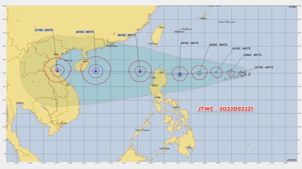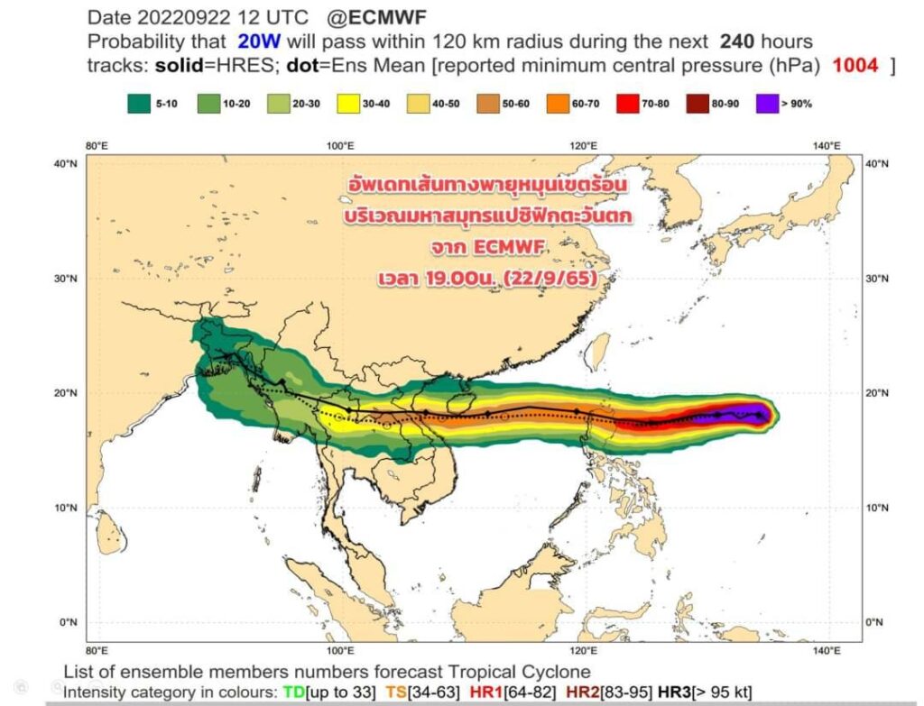 ทั้งนี้มีแนวโน้มว่า พายุลูกนี้อาจเคลื่อนตัวเข้าสู่ประเทศไทยช่วงวันที่ 27 -29 ก.ย. 65 แต่เนื่องจากยังอยู่ห่างไกลมากกรมอุตุนิยมวิทยาจึงต้องติดตามเป็นระยะๆ ซึ่งเมื่อเคลื่อนตัวลงสู่ทะเลจีนใต้แล้ว จะออกประกาศเตือน ให้ทราบอย่างต่อเนื่อง
