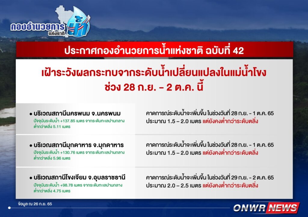 – สถานีโขงเจียม จังหวัดอุบลราชธานี ปัจจุบันระดับน้ำ +98.78 เมตร จากระดับทะเลปานกลาง ต่ำกว่าตลิ่ง 4.75 เมตร คาดการณ์ระดับน้ำจะเพิ่มขึ้นในช่วงวันที่ 29 กันยายน – 2 ตุลาคม 2565 ประมาณ 2.00 – 2.50 เมตร แต่ยังคงต่ำกว่าระดับตลิ่ง