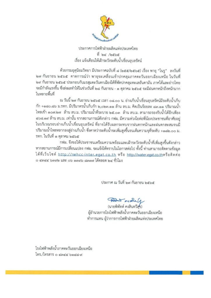 ล่าสุดการไฟฟ้าฝ่ายผลิตแห่งประเทศไทย (กฟผ.) ออกประกาศแจ้งเตือนให้เฝ้าระวังระดับน้ำเขื่อนอุบลรัตน์ จ.ขอนแก่น ซึ่งวันนี้มีปริมาณน้ำ 2,023 ล้าน ลบ.ม. คิดเป็น 83% น้ำไหลเข้าวันละ 107 ล้าน ลบ.ม. ระบาย 25 ล้าน ลบ.ม. สามารถรับน้ำได้อีกเพียง 408 ล้าน ลบ.ม. ซึ่งหากมีปริมาณน้ำไหลเข้ามากจากพายุ “โนรู” อาจทำให้น้ำเต็มความจุในวันที่ 1 ต.ค.นี้ ดังนั้น ในการประชุมคณะกรรมการลุ่มน้ำชี ในวันพรุ่งนี้ (28 ก.ย.65) อาจมีการพิจารณาปรับเพิ่มการระบายน้ำจากเขื่อนอุบลรัตน์.-สำนักข่าวไทย