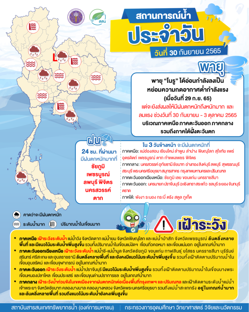 ดร.สุทัศน์ วีสกุล ผู้อำนวยการสถาบันสารสนเทศทรัพยากรน้ำ (องค์การมหาชน) กล่าวว่า พายุดีเปรสชัน “โนรู” อ่อนกำลังลงเป็นหย่อมความกดอากาศต่ำกำลังแรงตั้งแต่เมื่อวานนี้ (29 ก.ย.) โดยจะยังมีอิทธิพลทำให้ฝนตกในวันนี้ ประกอบกับลมมรสุมตะวันตกเฉียงใต้ยังคงพัดปกคลุม ซึ่งจะทำให้ทุกภาคมีฝนตกต่อเนื่อง บริเวณภาคตะวันออกเฉียงเหนือ ภาคเหนือตอนล่าง ภาคกลาง ภาคตะวันออก และภาคใต้ฝั่งตะวันตก จนถึงวันที่ 3 ตุลาคม 2565 โดยบางพื้นที่จะมีฝนตกหนักถึงหนักมาก