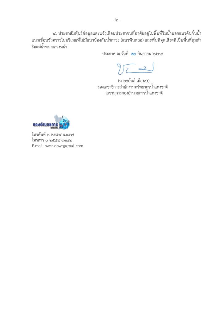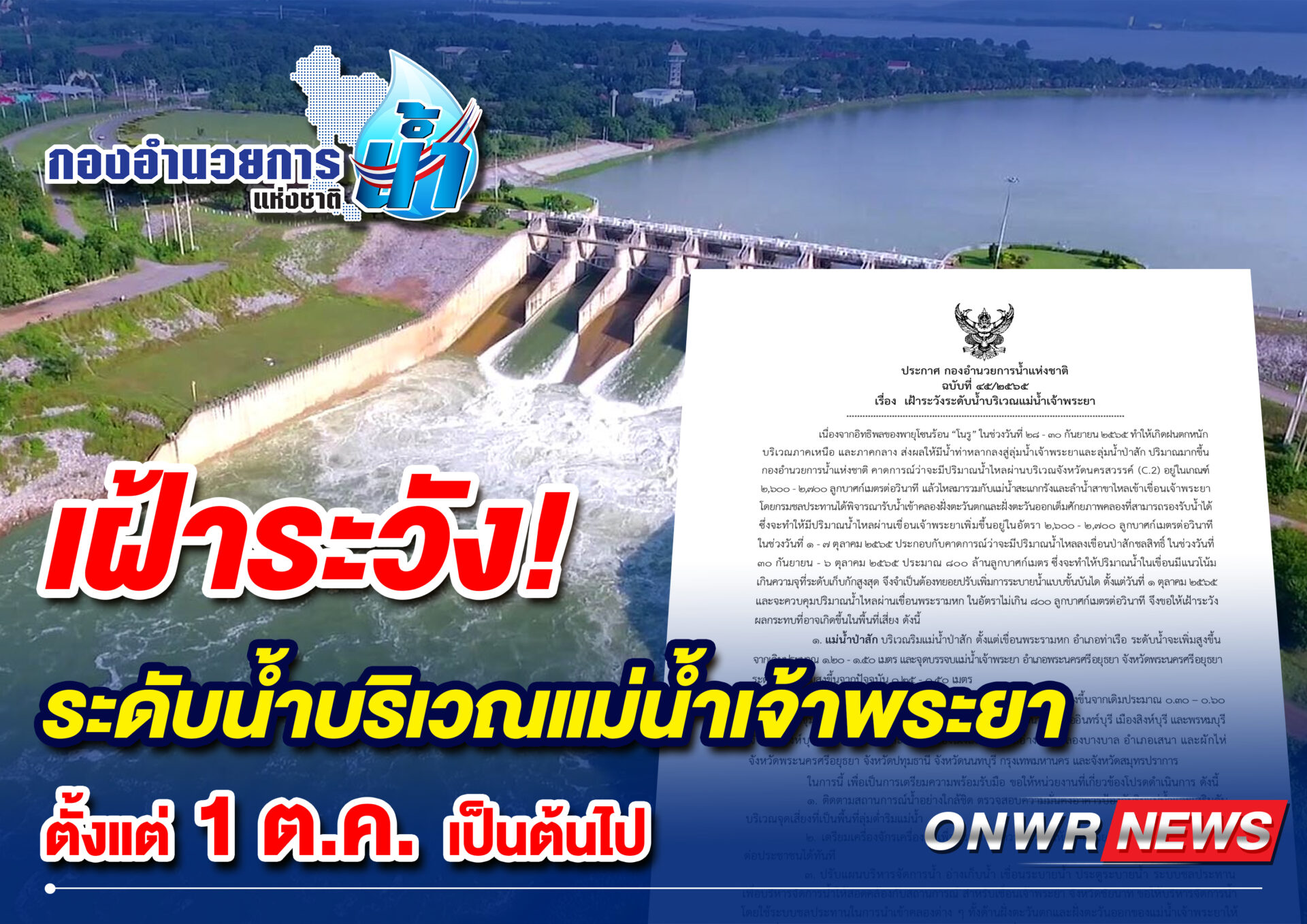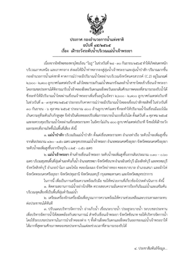 นายชยันต์ เมืองสง รองเลขาธิการสำนักงานทรัพยากรน้ำแห่งชาติ (สทนช.) ในฐานะเลขานุการกองอำนวยการน้ำแห่งชาติ (กอนช.) กล่าวว่า ได้ออกประกาศแจ้งเตือนให้ประชาชนในลุ่มน้ำเจ้าพระยาตอนล่างให้เฝ้าระวังระดับน้ำแม่น้ำเจ้าพระยาที่จะสูงขึ้น เนื่องจากอิทธิพลของพายุโซนร้อน “โนรู” ในช่วงวันที่ 28 – 30 กันยายน ทำให้เกิดฝนตกหนักบริเวณภาคเหนือและภาคกลาง ส่งผลให้มีน้ำท่าหลากลงสู่ลุ่มน้ำเจ้าพระยาและลุ่มน้ำป่าสักเป็นปริมาณมากขึ้น กองอำนวยการน้ำแห่งชาติคาดการณ์ว่า จะมีปริมาณน้ำไหลผ่านบริเวณจังหวัดนครสวรรค์ (C.2) อยู่ในเกณฑ์ 2,600 – 2,700 ลูกบาศก์เมตรต่อวินาที แล้วไหลมารวมกับแม่น้ำสะแกกรังและลำน้ำสาขาไหลเข้าเขื่อนเจ้าพระยา โดยกรมชลประทานได้พิจารณารับน้ำเข้าคลองฝั่งตะวันตกและฝั่งตะวันออกเต็มศักยภาพคลองที่สามารถรองรับน้ำได้ ซึ่งจะทำให้มีปริมาณน้ำไหลผ่านเขื่อนเจ้าพระยาเพิ่มขึ้นอยู่ในอัตรา 2,600 – 2,700 ลูกบาศก์เมตรต่อวินาทีในช่วงวันที่ 1 – 7 ตุลาคม