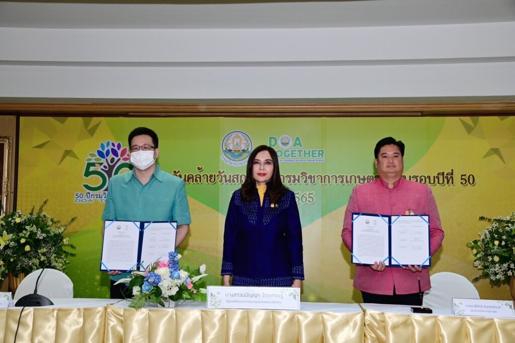 นายระพีภัทร์ จันทรศรีวงศ์ อธิบดีกรมวิชาการเกษตร กล่าวว่า นอกจากนี้ เนื่องในโอกาสวันสถาปนากรมวิชาการเกษตร ครบรอบ 50 ปี กรมวิชาการเกษตร จึงได้จัดให้มีพิธีลงนามความร่วมมือร่วมกับ 2 หน่วยงานที่เกี่ยวข้อง ได้แก่1) พิธีลงนามบันทึกข้อตกลงความร่วมมือด้านการพัฒนาโครงการที่เกี่ยวข้องกับการจัดการก๊าซเรือนกระจก ระหว่างกรมวิชาการเกษตร กับ องค์การบริหารจัดการก๊าซเรือนกระจก (องค์การมหาชน) โดยมี อธิบดีกรมวิชาการเกษตร กับนายรองเพชร บุญช่วยดี รองผู้อำนวยการองค์การบริหารจัดการก๊าซเรือนกระจก ร่วมลงนาม ซึ่งสอดคล้องกับนโยบายผลักดันเศรษฐกิจชีวภาพ เศรษฐกิจหมุนเวียน เศรษฐกิจสีเขียว BCG ให้เป็นกลไกที่สำคัญของการขับเคลื่อนระบบเศรษฐกิจของประเทศไทย