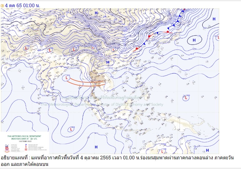 นางสาวชมภารี ชมภูรัตน์ อธิบดีกรมอุตุนิยมวิทยากล่าวว่า ระหว่างวันที่ 4-9 ต.ค. 65 ฝนทางตอนบนของภาคเหนือและภาคตะวันออกเฉียงเหนือจะเริ่มเบาลงบ้าง แต่ภาคตะวันออกเฉียงเหนือ ภาคกลาง รวมถึงกทม. และปริมณฑล) ภาคตะวันออก และภาคใต้ยังมีฝนตกต่อเนื่อง กับมีตกหนักบางแห่ง เนื่องมาจากมวลอากาศเย็นแผ่ลงมาปกคลุมทางตอนบน ทำให้ร่องมรสุมพาดผ่านภาคอีสานสานตอนล่าง ภาคกลาง และภาคตะวันออก ประกอบกับมรสุมตะวันตกเฉียงใต้กำลังปานกลางยังคงพัดปกคลุมทะเลอันดามัน ภาคใต้ และอ่าวไทย และมีลมตะวันออก ลมตะวันออกเฉียงใต้พัดปกคลุมภาคตะวันออกเฉียงเหนือเสริมอีกแรง จึงยังต้องระวังอันตรายจากฝนตกหนักและฝนที่ตกสะสมซึ่งอาจทำให้เกิดน้ำท่วมฉับพลันและน้ำป่าไหลหลาก โดยเฉพาะพื้นที่ลาดเชิงเขาใกล้ทางน้ำไหลผ่านและพื้นที่ลุ่มในระยะนี้