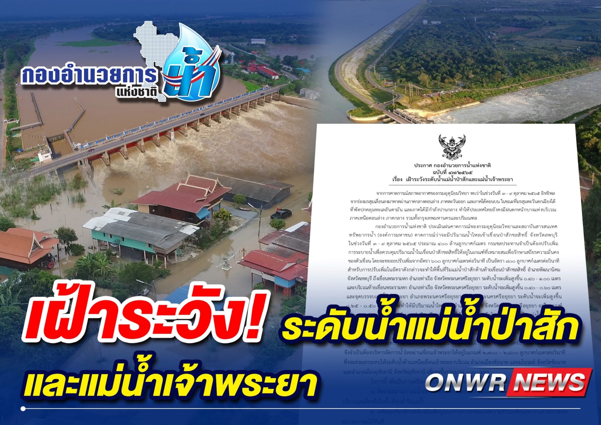 กรุงเทพฯ 4 ต.ค.- กอนช.เตือนประชาชนเฝ้าระวังระดับน้ำแม่น้ำป่าสักและแม่น้ำเจ้าพระยา เนื่องจากจำเป็นต้องปรับเพิ่มระบายน้ำจากเขื่อนป่าสักชลสิทธิ์ ซึ่งจะทำให้ระดับน้ำแม่น้ำป่าสักด้านท้ายเขื่อนสูงขึ้น 40 ซม. ถึง 1 เมตร ขณะเดียวกันระดับน้ำแม่น้ำเจ้าพระยา จะสูงขึ้นเนื่องจากน้ำจากแแม่น้ำยมและแม่น้ำปิงไหลลงมาเติม