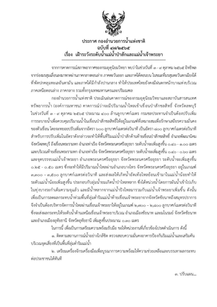นายชยันต์ เมืองสง รองเลขาธิการสำนักงานทรัพยากรน้ำแห่งชาติ (สทนช.) ในฐานะเลขานุการกองอำนวยการน้ำแห่งชาติ (กอนช.) กล่าวว่า กอนช. ได้ออกประกาศเตือนประชาชนเฝ้าระวังระดับน้ำแม่น้ำป่าสักและแม่น้ำเจ้าพระยาที่สูงขึ้น เนื่องจากกอนช. คาดการณ์สภาพอากาศของกรมอุตุนิยมวิทยา พบว่าในช่วงวันที่ 3 – 9 ตุลาคม อิทธิพลจากร่องมรสุมเลื่อนลงมาพาดผ่านภาคกลางตอนล่าง ภาคตะวันออก และภาคใต้ตอนบน ในขณะที่มรสุมตะวันตกเฉียงใต้ที่พัดปกคลุมทะเลอันดามัน และภาคใต้มีกำลังปานกลาง ทำให้ประเทศไทยยังคงมีฝนตกหนักบางแห่งบริเวณภาคเหนือตอนล่าง ภาคกลาง รวมทั้งกรุงเทพมหานครและปริมณฑล จากนั้นได้ประเมินฝนคาดการณ์ของกรมอุตุนิยมวิทยาและสถาบันสารสนเทศทรัพยากรน้ำ (องค์การมหาชน) คาดการณ์ว่าจะมีปริมาณน้ำไหลเข้าเขื่อนป่าสักชลสิทธิ์ จังหวัดลพบุรี ในช่วงวันที่ 3 – 9 ตุลาคม ประมาณ 400 ล้านลูกบาศก์เมตร