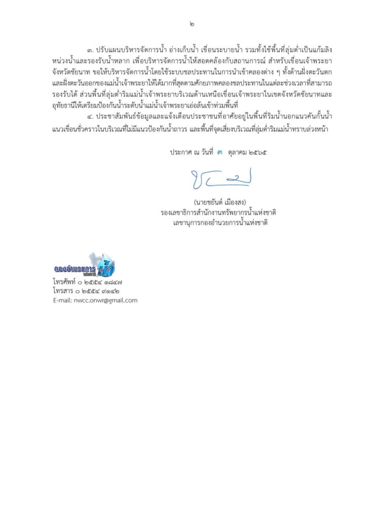 3. ปรับแผนบริหารจัดการน้ำ อ่างเก็บน้ำ เขื่อนระบายน้ำ รวมทั้งใช้พื้นที่ลุ่มต่ำเป็นแก้มลิง หน่วงน้ำและรองรับน้ำหลาก เพื่อบริหารจัดการน้ำให้สอดคล้องกับสถานการณ์ สำหรับเขื่อนเจ้าพระยา จังหวัดชัยนาท ขอให้บริหารจัดการน้ำโดยใช้ระบบชลประทานในการนำเข้าคลองต่าง ๆ ทั้งด้านฝั่งตะวันตกและฝั่งตะวันออกของแม่น้ำเจ้าพระยาให้ได้มากที่สุดตามศักยภาพคลองชลประทานในแต่ละช่วงเวลาที่สามารถรองรับได้ ส่วนพื้นที่ลุ่มต่ำริมแม่น้ำเจ้าพระยาบริเวณด้านเหนือเขื่อนเจ้าพระยาในเขตจังหวัดชัยนาทและอุทัยธานีให้เตรียมป้องกันน้ำระดับน้ำแม่น้ำเจ้าพระยาเอ่อล้นเข้าท่วมพื้นที่
