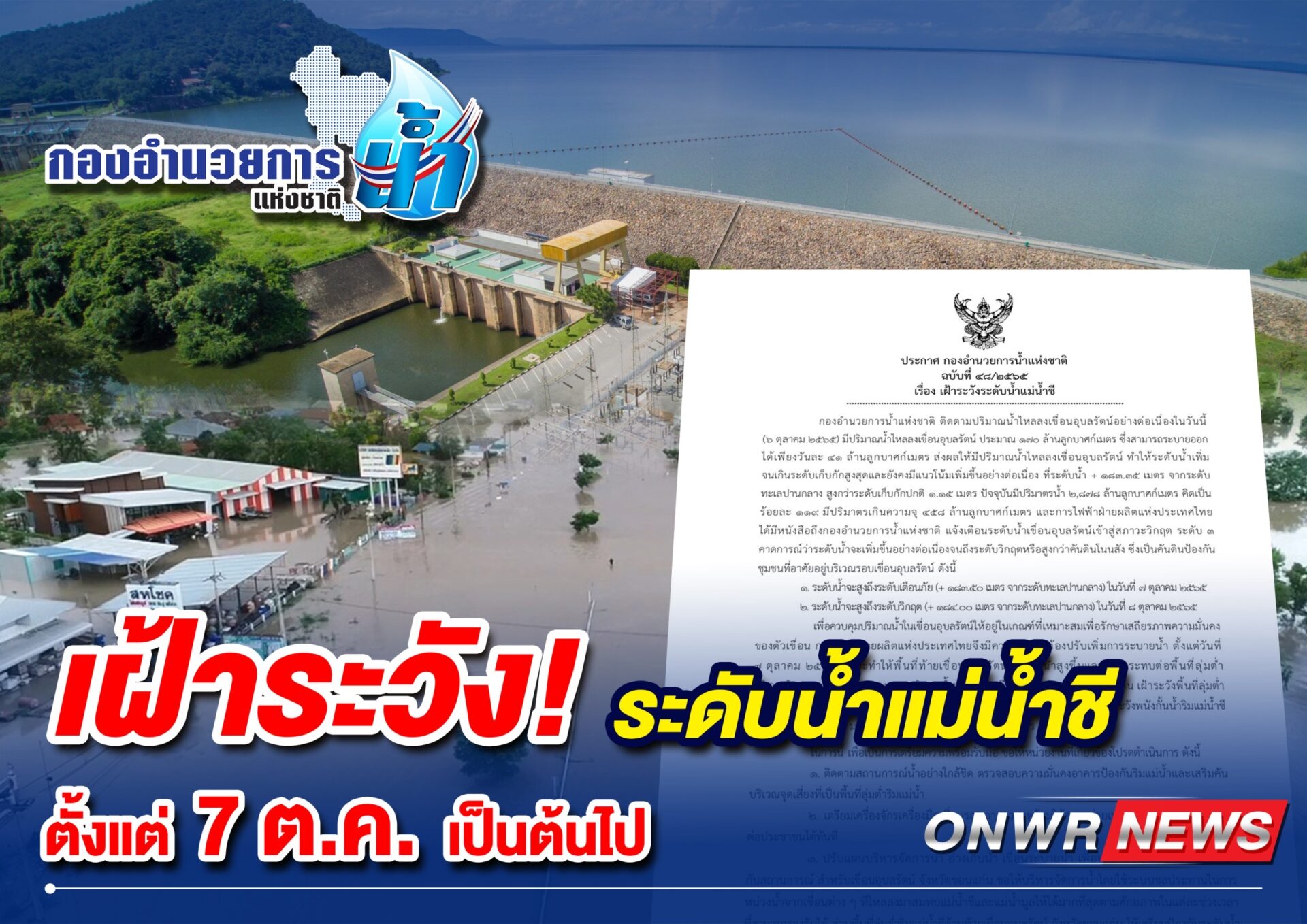 กรุงเทพฯ 7 ต.ค.- กองอำนวยการน้ำแห่งชาติ เตือนประชาชนเฝ้าะระวังระดับน้ำลำน้ำชีที่จะสูงขึ้นอีก จากการปรับเพิ่มการระบายน้ำเขื่อนอุบลรัตน์ เนื่องจากปริมาณน้ำในเขื่อนจะถึงระดับวิกฤติวันพรุ่งนี้