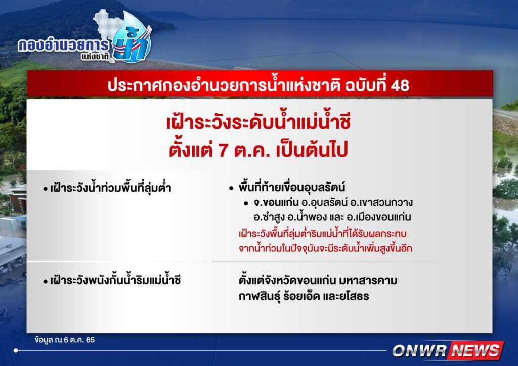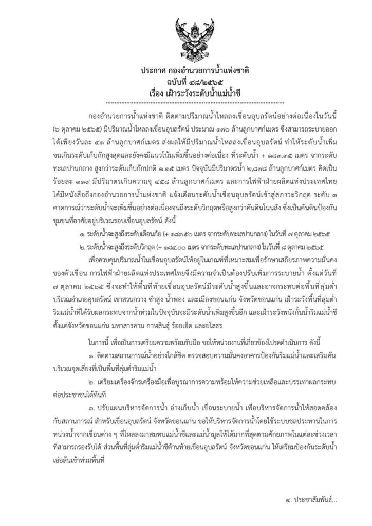 นายชยันต์ เมืองสง รองเลขาธิการสำนักงานทรัพยากรน้ำแห่งชาติ (สทนช.) ในฐานะเลขานุการกองอำนวยการน้ำแห่งชาติ (กอนช.) กล่าวว่า กอนช. ออกประกาศเตือนประชาชนเฝ้าระวังระดับน้ำในแม่น้ำชีที่จะสูงขึ้นอีก จากการปรับเพิ่มการระบายน้ำเขื่อนอุบลรัตน์ โดยวานนี้ (6 ตุลาคม) มีปริมาณน้ำไหลลงเขื่อนอุบลรัตน์ 170ล้านลูกบาศก์เมตร ซึ่งสามารถระบายออกได้เพียงวันละ 41 ล้านลูกบาศก์เมตร ส่งผลให้มีปริมาณน้ำไหลลงเขื่อนอุบลรัตน์ ทำให้ระดับน้ำเพิ่มจนเกินระดับเก็บกักสูงสุดและยังคงมีแนวโน้มเพิ่มขึ้นอย่างต่อเนื่อง ที่ระดับน้ำ 183.35 เมตร จากระดับทะเลปานกลาง สูงกว่าระดับเก็บกักปกติ 1.05 เมตร ปัจจุบันมีปริมาตรน้ำ 2,878 ล้านลูกบาศก์เมตร คิดเป็นร้อยละ 119 มีปริมาตรเกินความจุ 458 ล้านลูกบาศก์เมตร