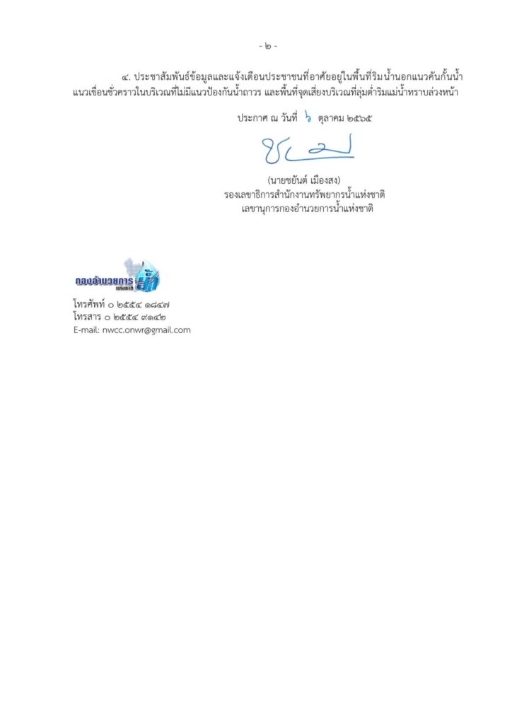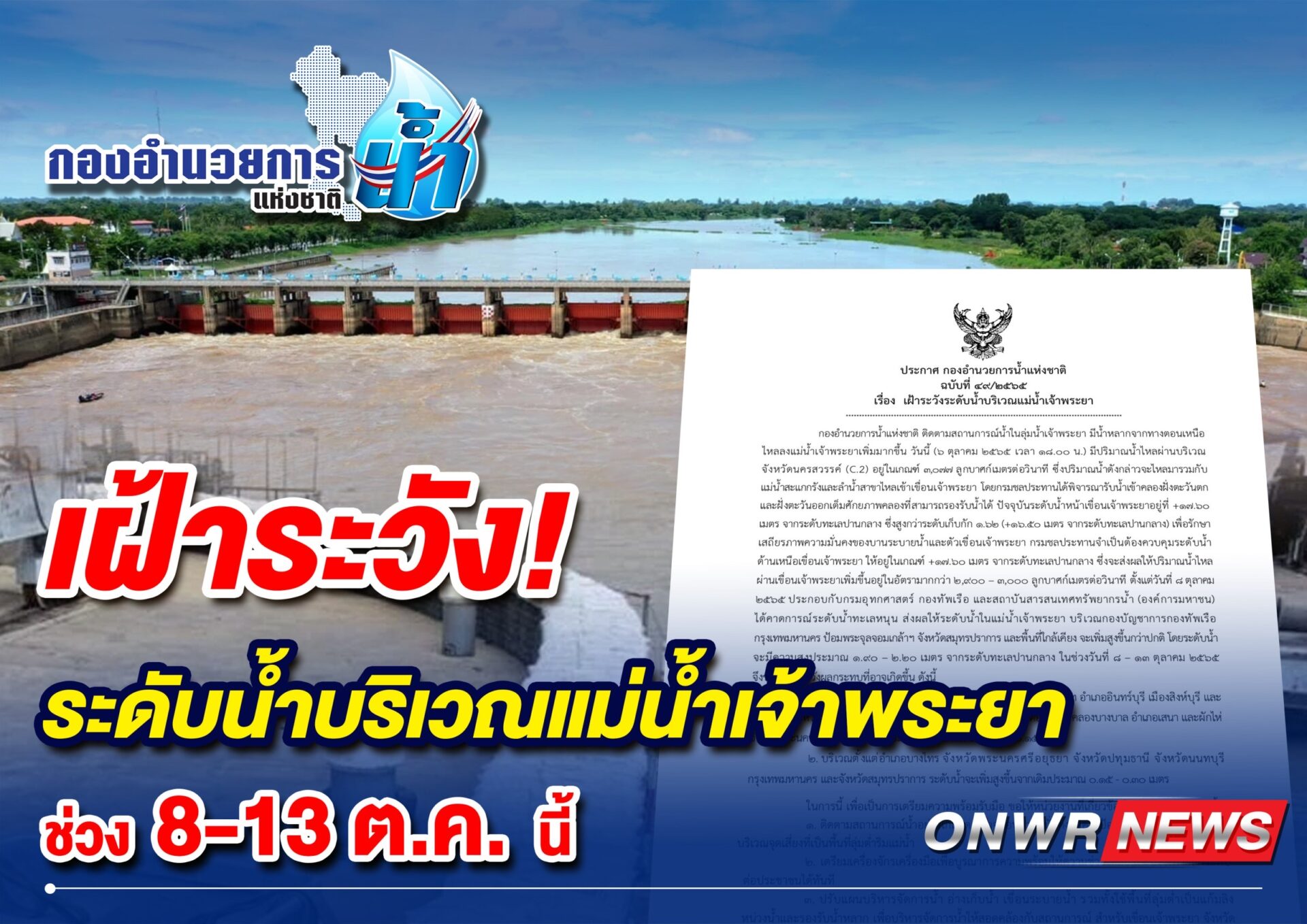 นายชยันต์ เมืองสง รองเลขาธิการสำนักงานทรัพยากรน้ำแห่งชาติ (สทนช.) ในฐานะเลขานุการกองอำนวยการน้ำแห่งชาติ (กอนช.) กล่าวว่า กอนช. ออกประกาศเตือนประชาชนเฝ้าระวังระดับน้ำบริเวณแม่น้ำเจ้าพระยา เนื่องจากมีน้ำหลากจากทางตอนเหนือไหลลงแม่น้ำเจ้าพระยาเพิ่มมากขึ้น วานนี้(๖ ตุลาคม) เวลา 18.๐๐ น.) มีปริมาณน้ำไหลผ่านบริเวณจังหวัดนครสวรรค์ (C.2) อยู่ในเกณฑ์ 3,177 ลูกบาศก์เมตรต่อวินาที ซึ่งปริมาณน้ำดังกล่าวจะไหลมารวมกับแม่น้ำสะแกกรังและลำน้ำสาขาไหลเข้าเขื่อนเจ้าพระยา โดยกรมชลประทานได้พิจารณารับน้ำเข้าคลองฝั่งตะวันตกและฝั่งตะวันออกเต็มศักยภาพคลองที่สามารถรองรับน้ำได้