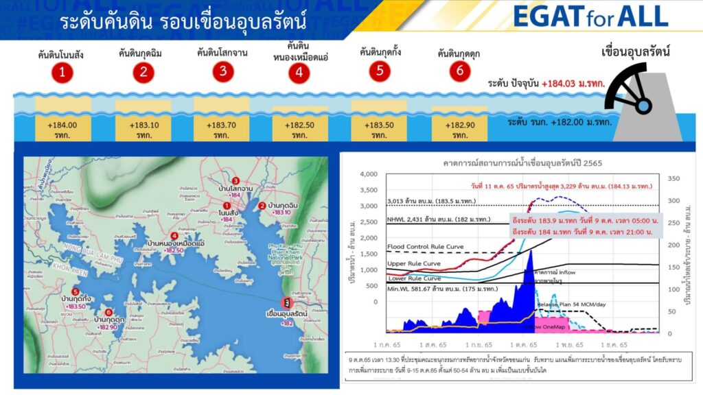 กฟผ. แจ้งเตือนประชาชนที่อยู่เหนือเขื่อนอุบลรัตน์ริมอ่างเก็บน้ำและท้ายเขื่อนอุบลรัตน์ ให้เฝ้าระวังเพื่อรับระดับน้ำในอ่างและลำน้ำพองท้ายเขื่อนที่สูงขึ้น เตรียมยกของขึ้นที่สูง เพื่อรับสถานการณ์ระดับน้ำที่จะสูงเพิ่มขึ้นในช่วงนี้
