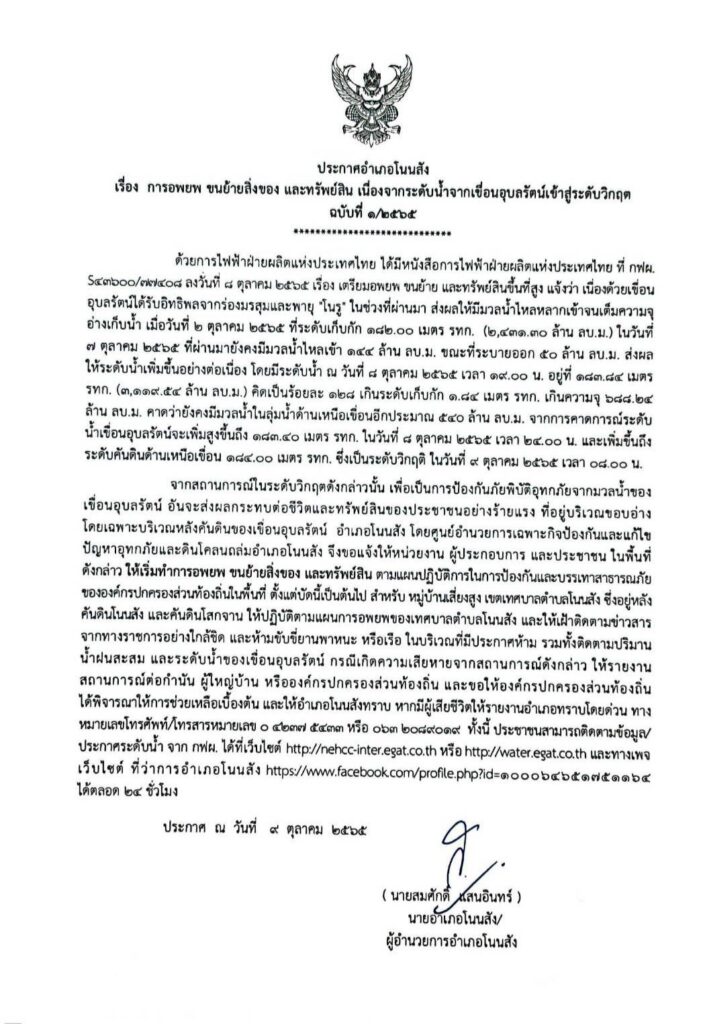 จากสถานการณ์ดังกล่าวทำให้นายสมศักดิ์ แสนอินทร์ นายอำเภอโนนสัง จ. หนองบัวลำภูออกประกาศเรื่อง การอพยพ ขนย้ายสิ่งของและทรัพย์สินเนื่องจากระดับน้ำเขื่อนอุบลรัตน์เข้าสู่ระดับวิกฤติ โดยให้ดำเนินการทันทีตามแผนปฏิบัติการในการป้องกันและบรรเทาสาธารณภัยขององค์กรปกครองส่วนท้องถิ่นในพื้นที่เพื่อเป็นการป้องกันภัยพิบัติอุทกภัยที่อาจเกิดขึ้นจากสถานการณ์น้ำในเขื่อนอุบลรัตน์เนื่องจากอาจส่งผลกระทบต่อชีวิตและทรัพย์สินของประชาชนอย่างร้ายแรง สำหรับหมู่บ้านเสี่ยงสูงในเขตเทศบาลตำบลโนนสังซึ่งอยู่หลังคันดินโนนสังและคันดินโสกจาน ให้ปฏิบัติตามแผนการอพยพของเทศบาลตำบลโนนสัง พร้อมให้เฝ้าติดตามข่าวสารจากทางราชการอย่างใกล้ชิด