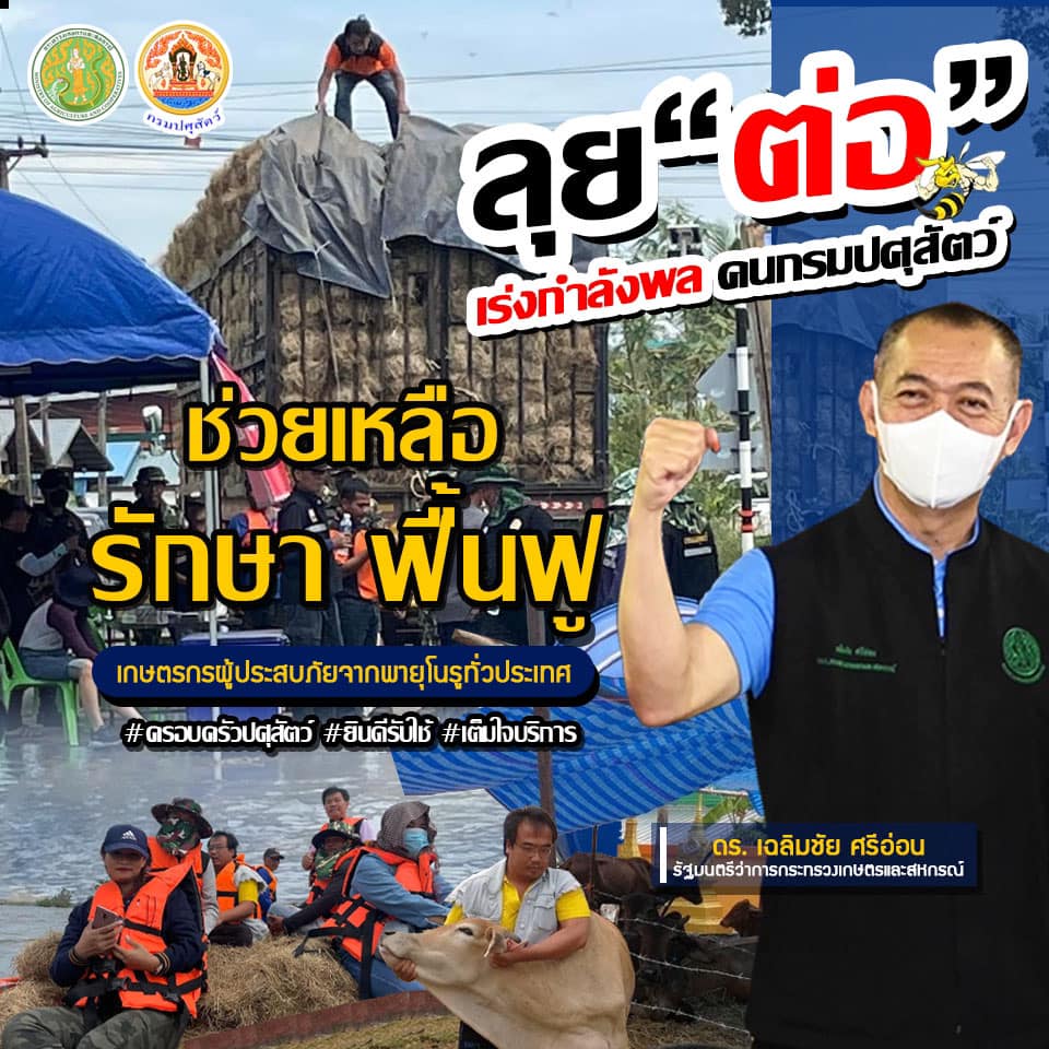 นายเฉลิมชัย ศรีอ่อน รัฐมนตรีว่าการกระทรวงเกษตรและสหกรณ์กล่าวว่า ได้สั่งการกรมปศุสัตว์ช่วยเหลือเกษตรกรผู้เลี้ยงสัตว์ในพื้นที่ประสบอุทกภัย ทั้งการอพยพสัตว์ ส่งเสบียงอาหารสัตว์ รวมถึงมอบเวชภัณฑ์ในการสร้างเสริมสุขภาพสัตว์ ซึ่งเป็นการดำเนินการต่อเนื่อง หลังจากที่ได้ปล่อยขบวนรถหญ้าอาหารสัตว์พระราชทานเพื่อสนับสนุนเสบียงอาหารสัตว์ไปช่วยเหลือเกษตรกร พร้อมจัดส่งเจ้าหน้าที่สัตวแพทย์และสัตวบาลเข้าดูแลรักษาสุขภาพสัตว์ป่วยทั่วประเทศแล้ว