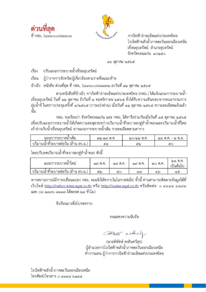 ทั้งนี้ ขอให้ประชาชนที่อยู่เหนือเขื่อนอุบลรัตน์ ริมอ่างเก็บน้ำ และท้ายเขื่อนอุบลรัตน์ เฝ้าระวังเพื่อรับระดับน้ำในอ่างเหนือเขื่อนและลำน้ำพองท้ายเขื่อนที่เปลี่ยนแปลงในช่วงนี้