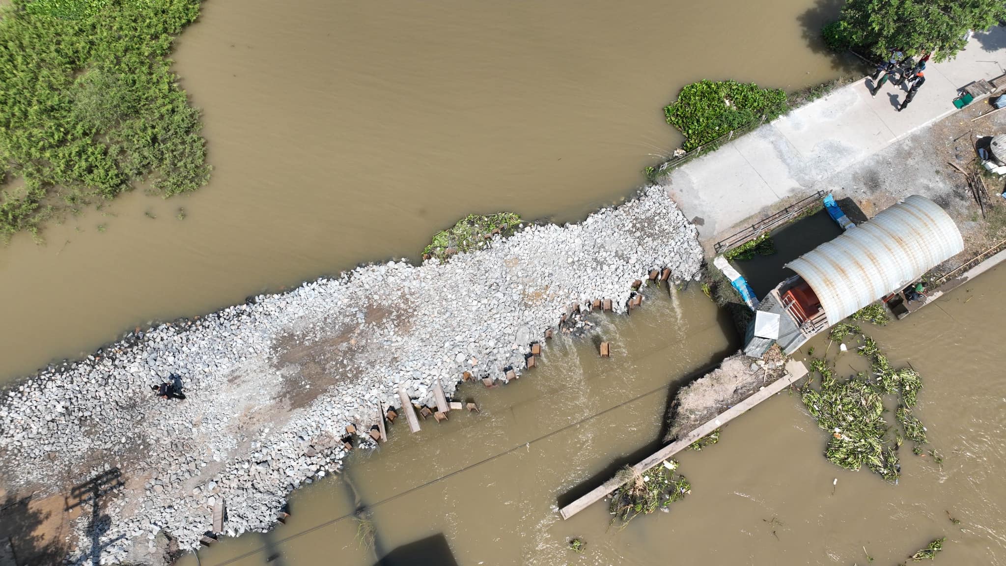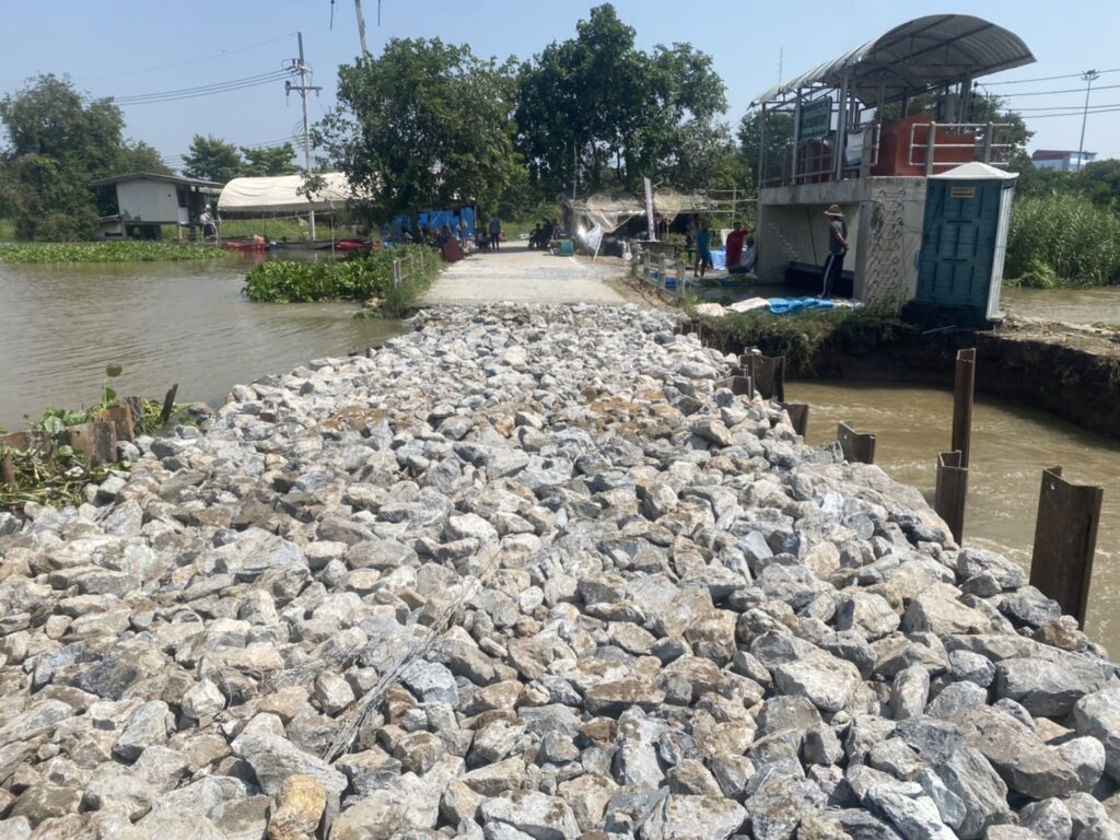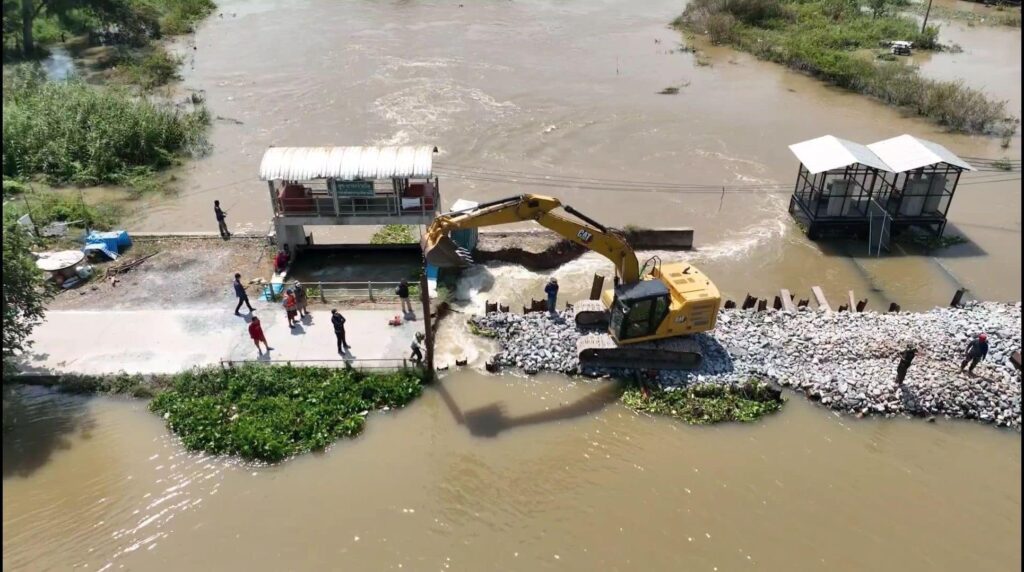 หลังเกิดเหตุคืนวันที่ 17 ต.ค. ได้ระดมเครื่องจักร เครื่องมือ และกำลังคนเข้าปฏิบัติงานตลอด 24 ชั่วโมง เร่งซ่อมแซมปิดช่องที่ขาดกว้างเกือบ 20 เมตร ด้วยการใช้แผ่นเหล็กชีทไพล์ (Sheet piles) ตอกฝังลงไปในดิน พร้อมวางกล่องลวดถักบรรจุหินใหญ่ (Gabion) จนปิดช่องขาดได้สำเร็จ จากนั้นเสริมความแข็งแรง โดยสามารถใช้เป็นคันกั้นน้ำและทางสัญจรได้เช่นเดิมแล้ว