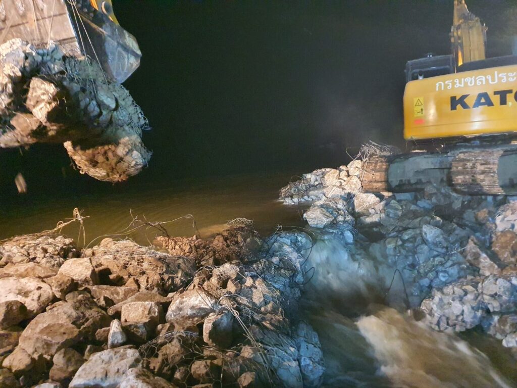 ทั้งนี้ได้ซ่อมแซมด้วยการวางกล่องลวดถักบรรจุหินใหญ่ (Gabion) ถมปิดช่องขาด แต่เนื่องจากระดับน้ำทางตอนบนเพิ่มสูงขึ้น ส่งผลให้กระแสน้ำไหลผ่านแรงมากขึ้น ทำให้การปฏิบัติงานไม่เป็นไปตามแผนที่วางไว้ จำเป็นต้องปรับเปลี่ยนวิธีการปฏิบัติงาน ซึ่งต้องใช้เวลาพอสมควร แต่กรมชลประทานเร่งดำเนินการให้สำเร็จเพื่อลดผลกระทบด้านท้ายน้ำ รวมเวลาซ่อมแซม 8 วัน.-สำนักข่าวไทย