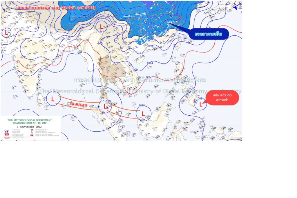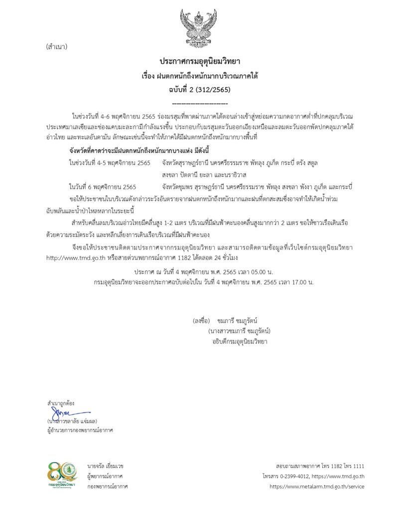 นายประพิศ จันทร์มา อธิบดีกรมชลประทานเปิดเผยว่า ตามที่กรมอุตุนิยมวิทยาออกประกาศ เรื่อง ฝนตกหนักถึงหนักมากบริเวณภาคใต้ ในช่วงวันที่ 4-6 พฤศจิกายน 2565 เนื่องจากร่องมรสุมที่พาดผ่านภาคใต้ตอนล่างเข้าสู่หย่อมความกดอากาศต่ำที่ปกคลุมบริเวณประเทศมาเลเซียและช่องแคบมะละกามีกำลังแรงขึ้น ประกอบกับมรสุมตะวันออกเฉียงเหนือและลมตะวันออกพัดปกคลุมภาคใต้ อ่าวไทย และทะเลอันดามัน ลักษณะเช่นนี้จะทำให้ภาคใต้มีฝนตกหนักถึงหนักมากบางพื้นที่ จึงสั่งการให้โครงการชลประทานทุกแห่งเฝ้าระวังพื้นที่เสี่ยงอุทกภัยทั้งน้ำท่วมฉับพลันและน้ำหลาก ประกอบด้วย จังหวัดสุราษฎร์ธานี นครศรีธรรมราช พัทลุง ภูเก็ต กระบี่ พังงา ตรัง สตูล สงขลา ปัตตานี ยะลา และนราธิวาส