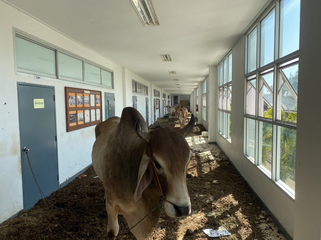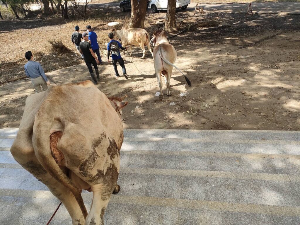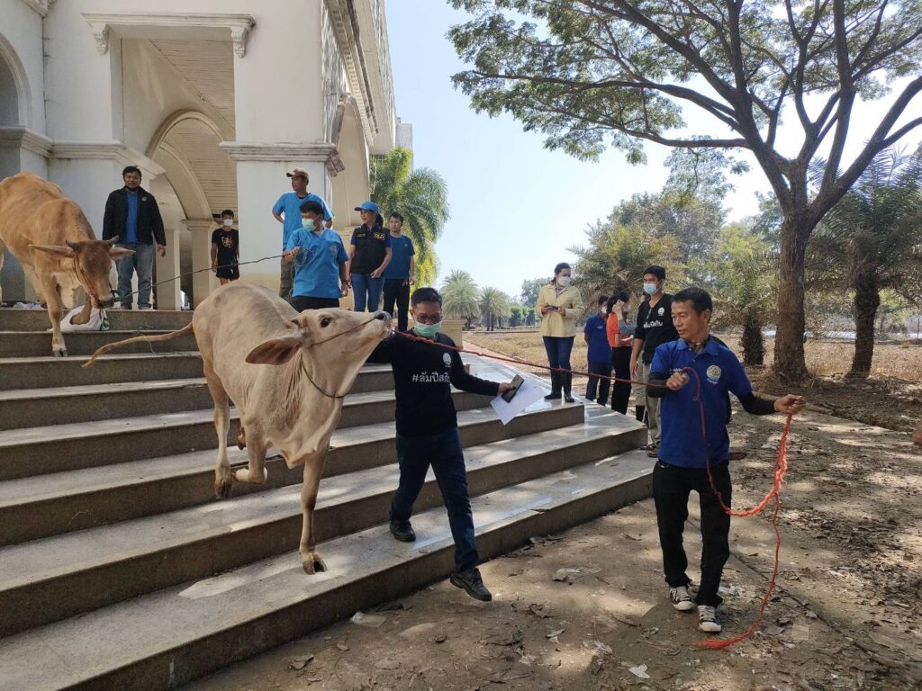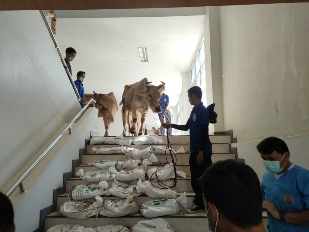 ทั้งนี้เจ้าหน้าที่ปศุสัตว์จังหวัดอุบลราชธานีและสำนักงานปศุสัตว์อำเภอเมืองอุบลราชธานี พร้อมด้วยทีมงานอาสาปศุสัตว์อำเภอเมืองอุบลราชธานีได้ช่วยกันนำกระสอบมาวางตามขั้นบันไดเพื่อกันลื่นและลดแรงกระแทกขณะโคก้าวลง จนลงมาถึงพื้นดินอย่างปลอดภัยทุกตัว จากนั้นนำเข้าสู่คอกเรียบร้อยแล้ว ทางมหาวิทยาลัยจะทำความสะอาดตึกเพื่อเปิดการเรียนต่อไป