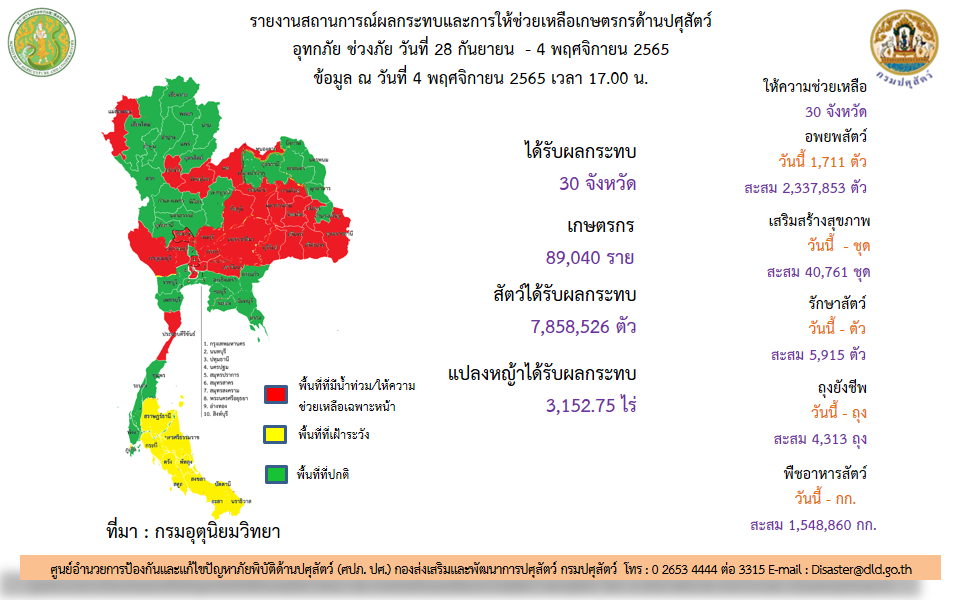 สำหรับรายงานสถานการณ์ผลกระทบและความคืบหน้าการให้ความช่วยเหลือเกษตรกรด้านปศุสัตว์ที่ประสบอุทกภัยระหว่างวันที่ 28 กย – 4 พ.ย. 65 (ข้อมูล ณ วันที่ 4 พ.ย. 65 เวลา 17.00 น.) มีดังนี้