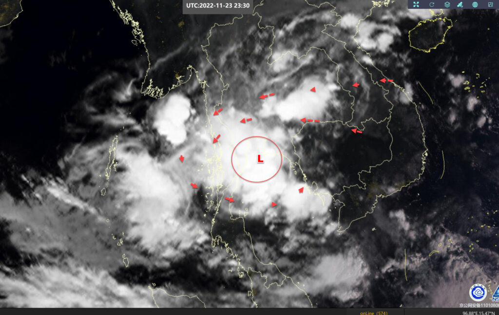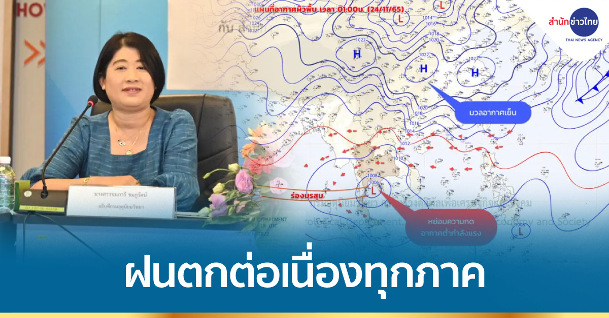 นางสาวชมภารี ชมภูรัตน์ อธิบดีกรมอุตุนิยมวิทยากล่าวว่า หย่อมความกดอากาศต่ำกำลังแรงปกคลุมอ่าวไทยตอนบนและภาคตะวันออก ประกอบกับร่องมรสุมพาดผ่านภาคใต้ตอนบน เมฆฝนปกคลุมบริเวณอ่าวไทยและภาคใต้ตอนบนช่วงวันที่ 24-26 พ.ย. ซึ่งจะทำให้ประเทศไทยยังมีฝนตกต่อเนื่องและมีฝนตกหนักบางแห่ง โดยเฉพาะบริเวณภาคเหนือตอนล่าง ภาคตะวันออกเฉียงเหนือตอนล่าง ภาคกลาง รวมกทม. – ปริมณฑล และภาคตะวันออก