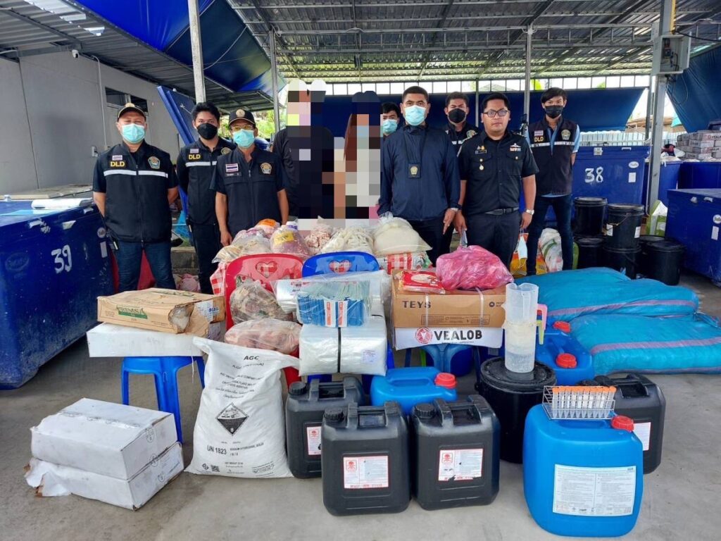 ทั้งนี้ พนักงานเจ้าหน้าที่ได้ยึดอายัดของกลางเป็นชิ้นส่วนเนื้อและเครื่องในหมูและวัวที่อยู่ในสถานประกอบการและในตู้แช่เย็นคอนเทนเนอร์กว่า 25,000 กิโลกรัม มูลค่ากว่า 5 ล้านบาท นอกจากนี้ได้ยึดอายัดของกลางสารเคมีและแกลลอนบรรจุสารฟอร์มาลีน ขนาด 25 ลิตร กว่า 50 แกลลอน รวมถึงได้ยึดใบเสร็จกว่า 2,300 ใบ ที่เป็นหลักฐานการขายให้ลูกค้าร้านหมูกระทะและร้านอาหารอีสาน 66 ราย พนักงานเจ้าหน้าที่นำตัวอย่างเนื้อและเครื่องในสัตว์ส่งตรวจทางห้องปฏิบัติการ สำนักตรวจสอบคุณภาพสินค้าปศุสัตว์ กรมปศุสัตว์ เพื่อตรวจหาเชื้อโรคปนเปื้อนที่เป็นอันตราย และตรวจหาสารเคมีตกค้าง (ฟอร์มาลีน) โดยคาดว่า เจ้าของกิจการนำเครื่องในแช่ฟอร์มาลีนเพื่อไม่ให้เน่า แช่โซดาไฟเพื่อให้เนื้อและเครื่องในเด้งกรอบ เนื่องจากมีฤทธิ์เป็นด่าง ส่วนที่แช่ไฮโดรเจนเปอร์ออกไซด์ ซึ่งเป็นสารฟอกขาว เพื่อให้เครื่องในขาว