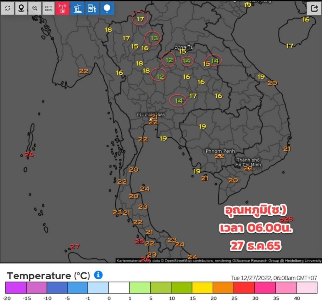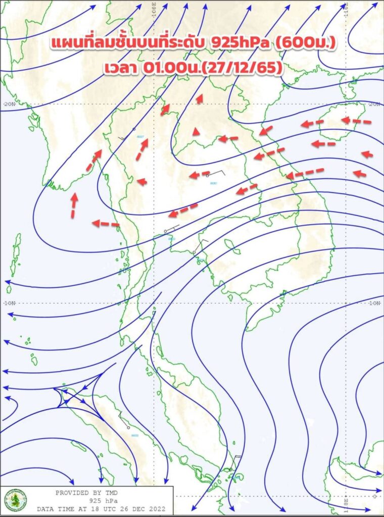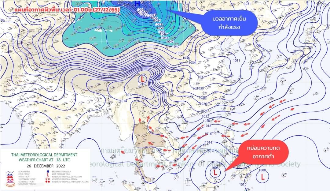 นางสาวชมภารี ชมภูรัตน์ อธิบดีกรมอุตุนิยมวิทยากล่าวว่า ช่วงวันที่ 27 ธ.ค. 65 – 5 ม.ค. 66 ประเทศไทยตอนบนอากาศเย็นต่อเนื่อง ท้องฟ้าโปร่ง แดดแรงโดยเฉพาะในช่วงกลางวัน เนื่องจากมวลอากาศเย็นกำลังปานกลางถึงค่อนข้างแรงยังแผ่เสริมลงมาปกคลุมประเทศไทยตอนบนและทะเลจีนใต้ ทำให้ภาคเหนือ ภาคตะวันออกเฉียงเหนือ ภาคกลาง ภาคตะวันออก รวมถึงกรุงเทพมหานครและปริมณฑลมีอากาศเย็นถึงหนาวกับมีหมอกในตอนเช้า ส่วนยอดดอย ยอดภูยังมีอากาศหนาวถึงหนาวจัด จึงขอเตือนประชาชนระวังรักษาสุขภาพจากสภาพอากาศที่หนาวเย็นลง ระวังอัคคีภัยและการเดินทางสัญจรผ่านบริเวณที่มีหมอกด้วย สำหรับภาคใต้ ฝนน้อยลง แต่เกิดขึ้นได้บ้างบริเวณภาคใต้ตอนล่าง คลื่นลมมีกำลังค่อนข้างแรง ชาวเรือ ชาวประมง ยังต้องเดินเรือด้วยความระวัง