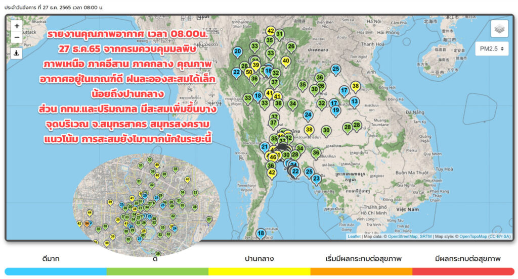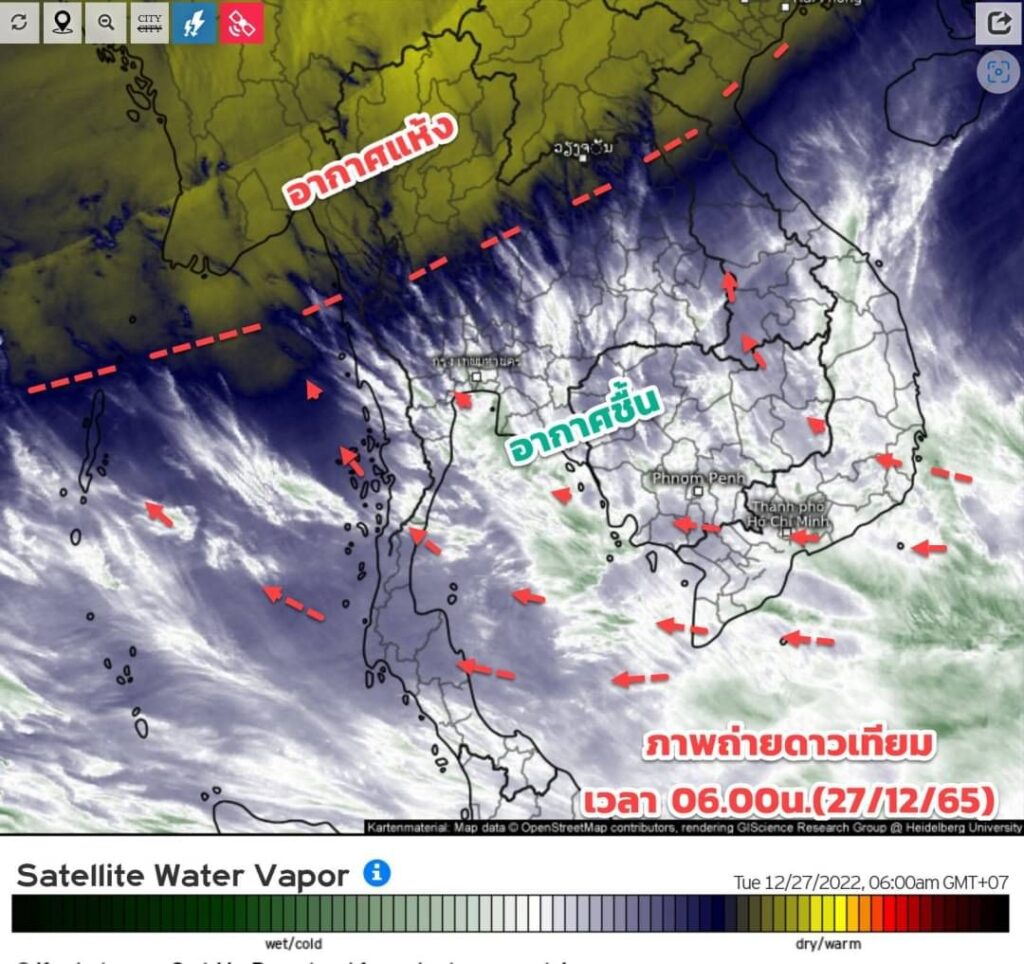 กรุงเทพฯ 27 ธ.ค. – อธิบดีกรมอุตุนิยมวิทยาเผย ระยะนี้จนถึงตลอดเทศกาลปีใหม่ อากาศประเทศไทยตอนบนเย็นถึงหนาว เนื่องจากมวลอากาศเย็นกำลังปานกลางถึงค่อนข้างแรง ยังแผ่เสริมลงมาปกคลุม ส่วนภาคใต้ฝนน้อย แต่ภาคใต้ตอนล่างยังมีฝนบ้าง ลมหนาวที่แรงทำให้การสะสมของฝุ่น PM2.5 ไม่มาก โดยอากาศจะเริ่มอุ่นขึ้นตั้งแต่ 3 ม.ค. 66