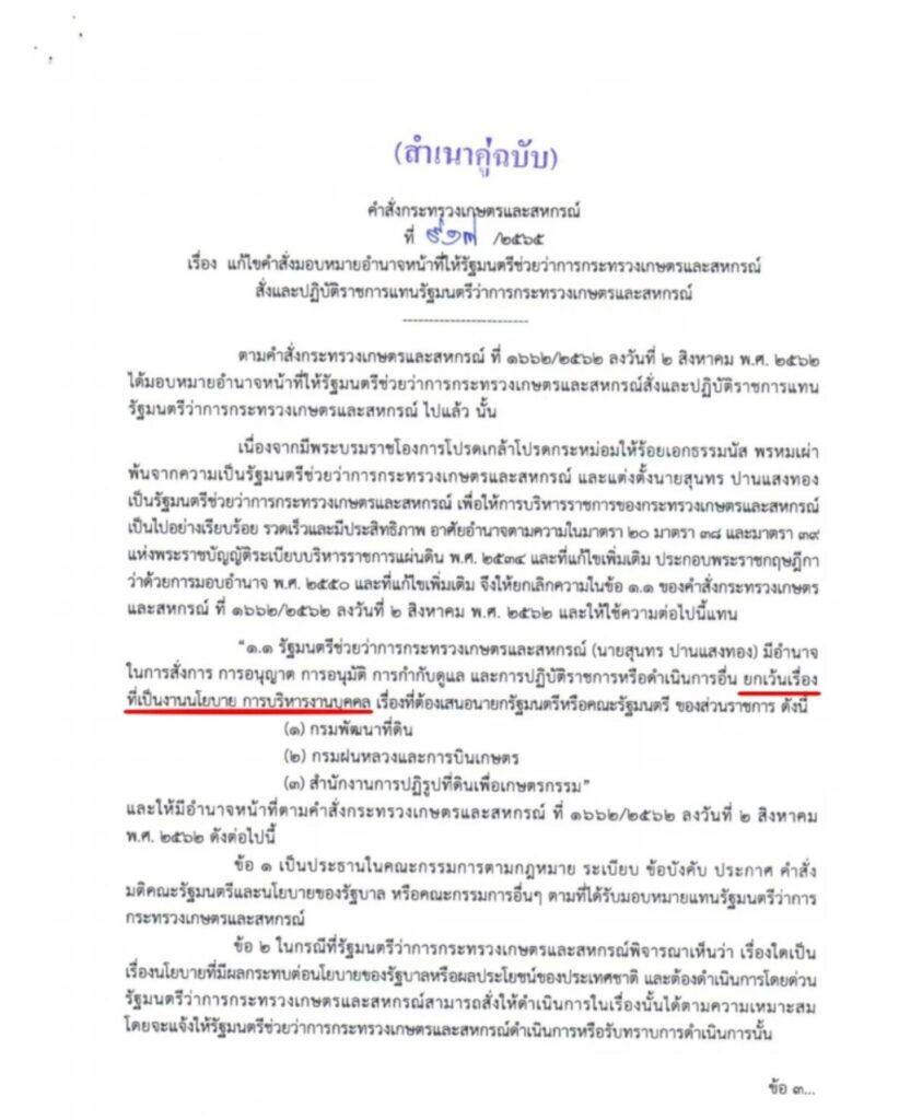 ส่วนที่นายเฉลิมชัยออกคำสั่งกระทรวงเกษตรและสหกรณ์เรื่อง การมอบหมายอำนาจหน้าที่ให้รัฐมนตรีช่วยว่าการกระทรวงเกษตรและสหกรณ์ สั่งและปฏิบัติราชการแทนรัฐมนตรีว่าการกระทรวงเกษตรและสหกรณ์ โดยระบุให้นายสุนทรซึ่งกำกับดูแลกรมฝนหลวงและการบินเกษตร กรมพัฒนาที่ดิน สำนักงานการปฏิรูปที่ดินเพื่อเกษตรกรรม (ส.ป.ก.) สามารถอนุญาต อนุมัติการปฏิบัติราชการหรือดำเนินการต่างๆ ได้ ยกเว้นเรื่องที่เป็นงานนโยบาย การบริหารงานบุคคล เรื่องที่ต้องเสนอนายกรัฐมนตรีหรือคณะรัฐมนตรี จะเป็นอุปสรรคต่อการทำงานหรือไม่ นายสุนทรกล่าวว่า รัฐมนตรีในกระทรวงเดียวกันและในครม. เดียวกัน ต้องทำงานไม่แบ่งเป็นพรรคเพราะต้องร่วมกันดูแลประชาชน.-สำนักข่าวไทย
